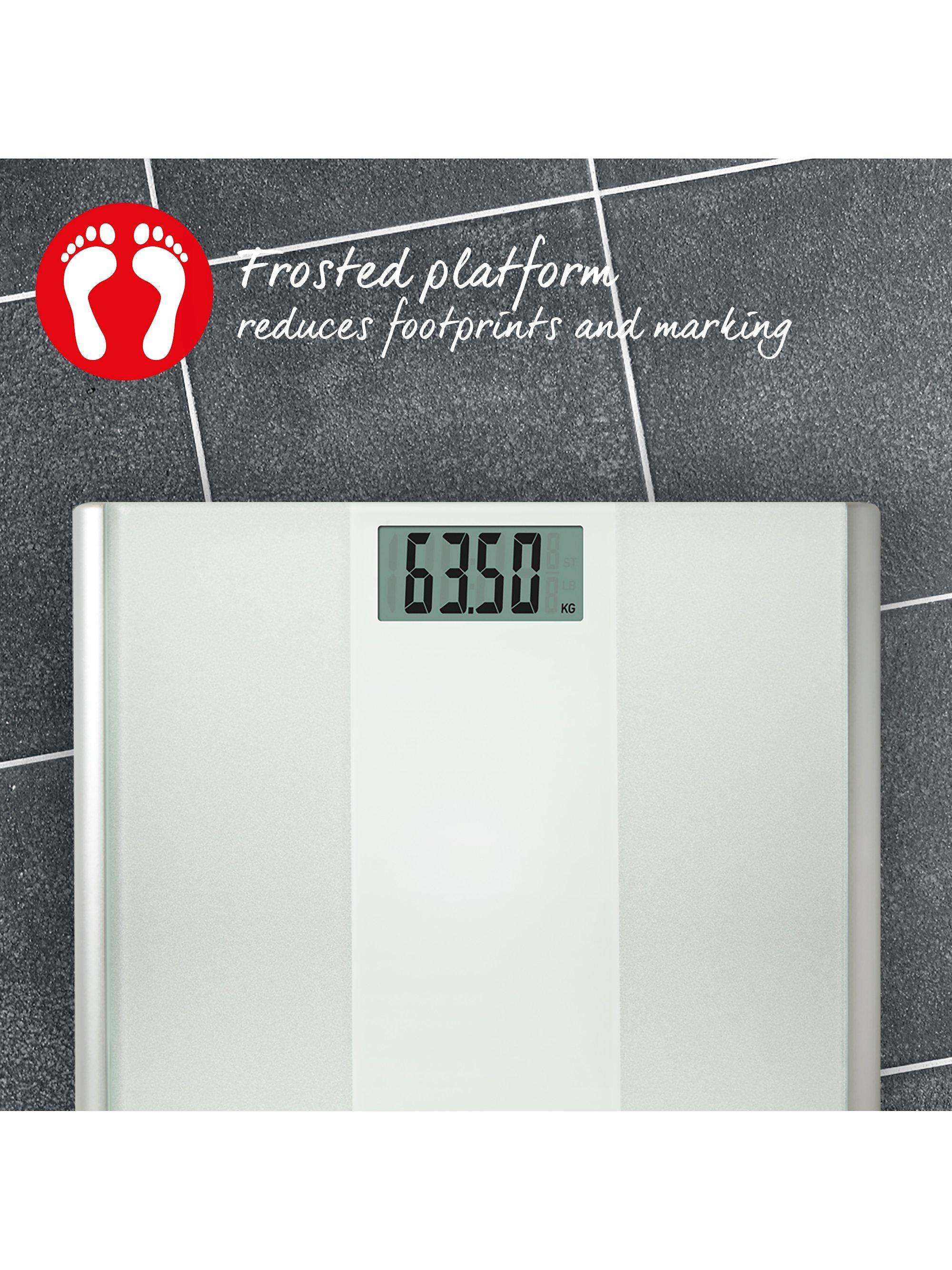 It's made from ultra-slim toughened glass with a frosted glass platform that reduces footprints and markings. Simply step-on to get your instant weight reading shown on the large easy-to-ready LCD display.