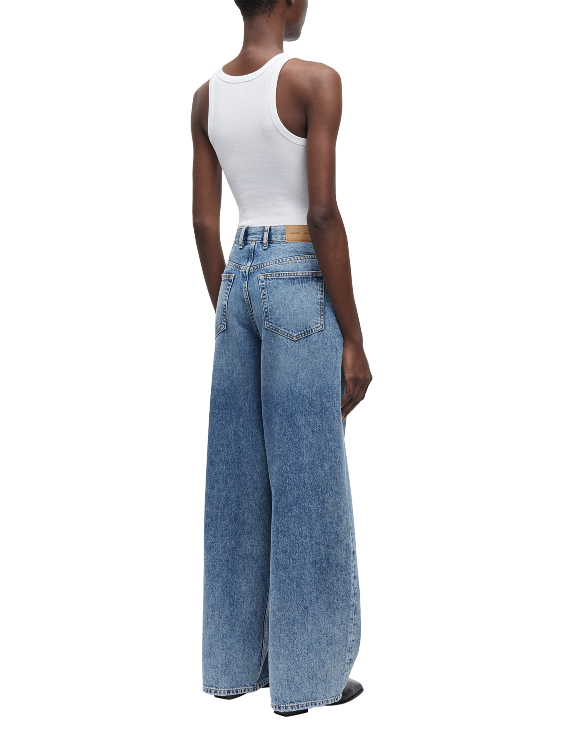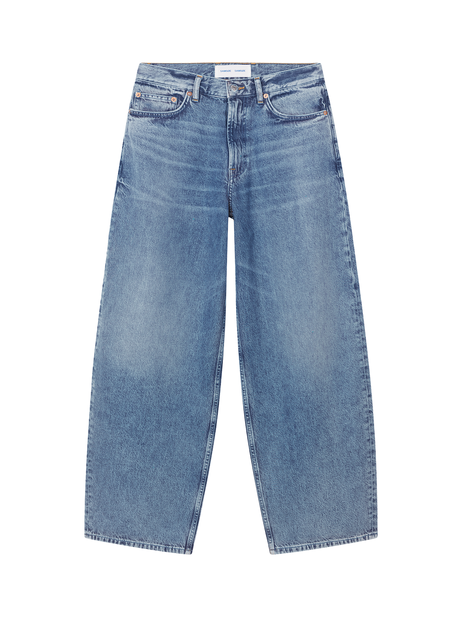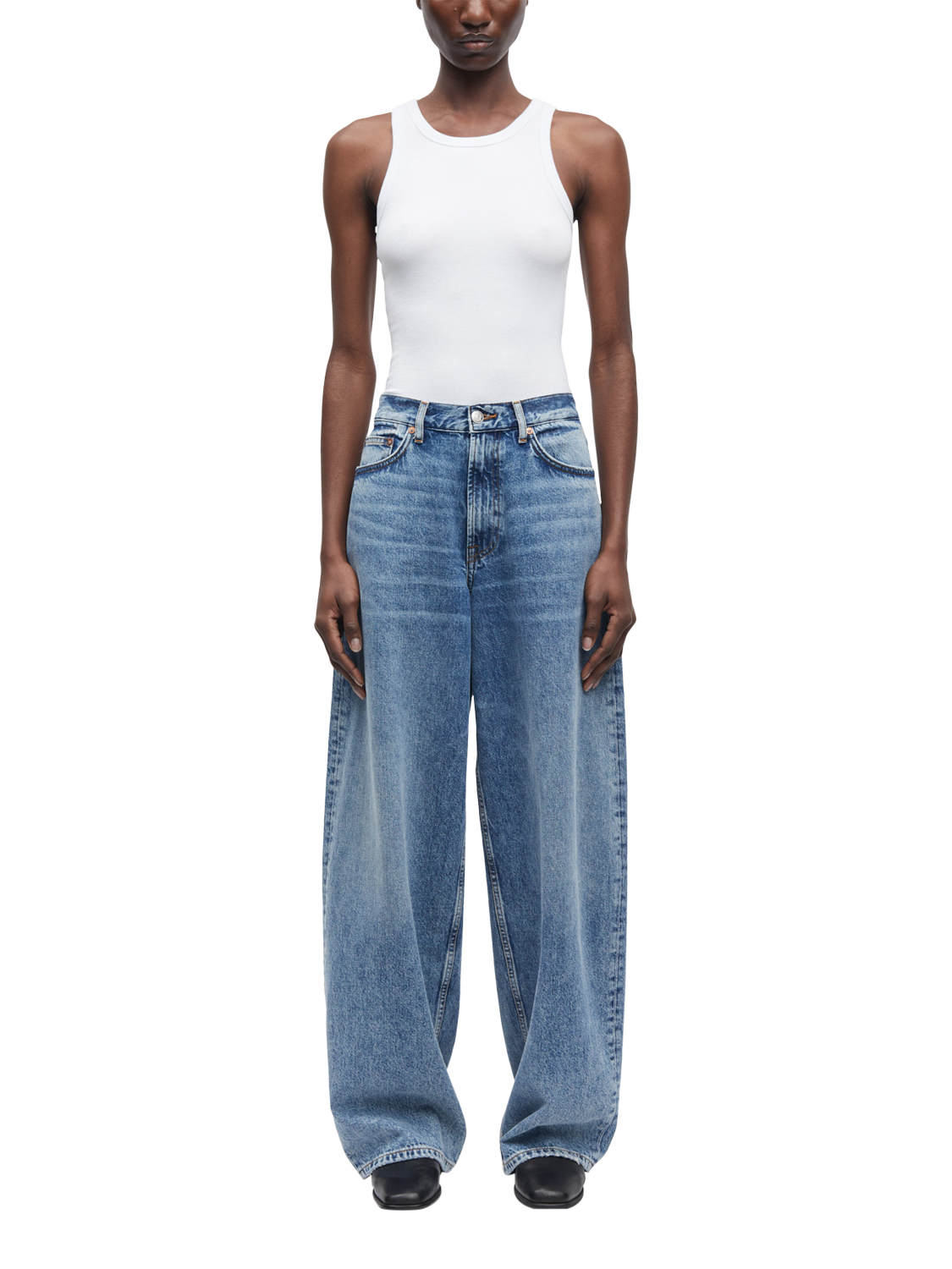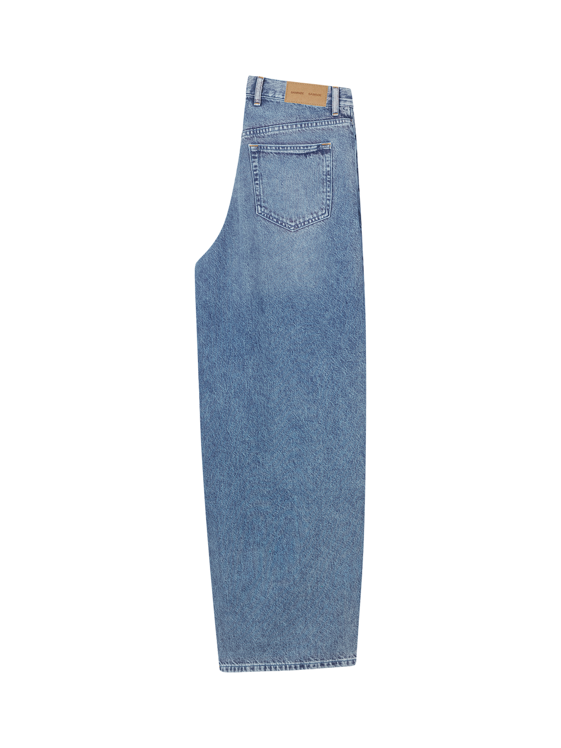 Mid-waist jeans with a loose fit and curved leg. Featuring a button and zipper closure on the front, they're a classic five-pocket style made from cotton denim.