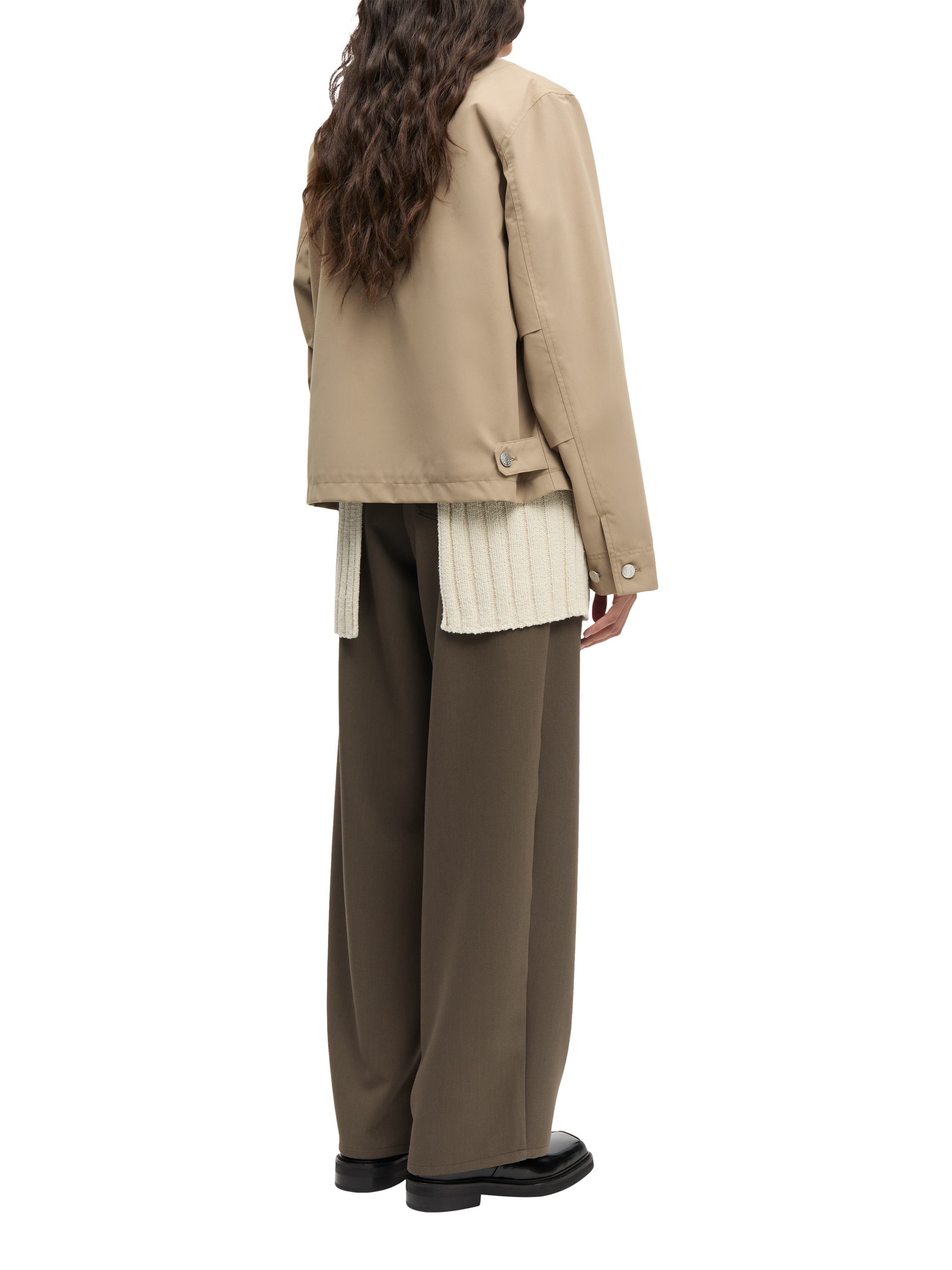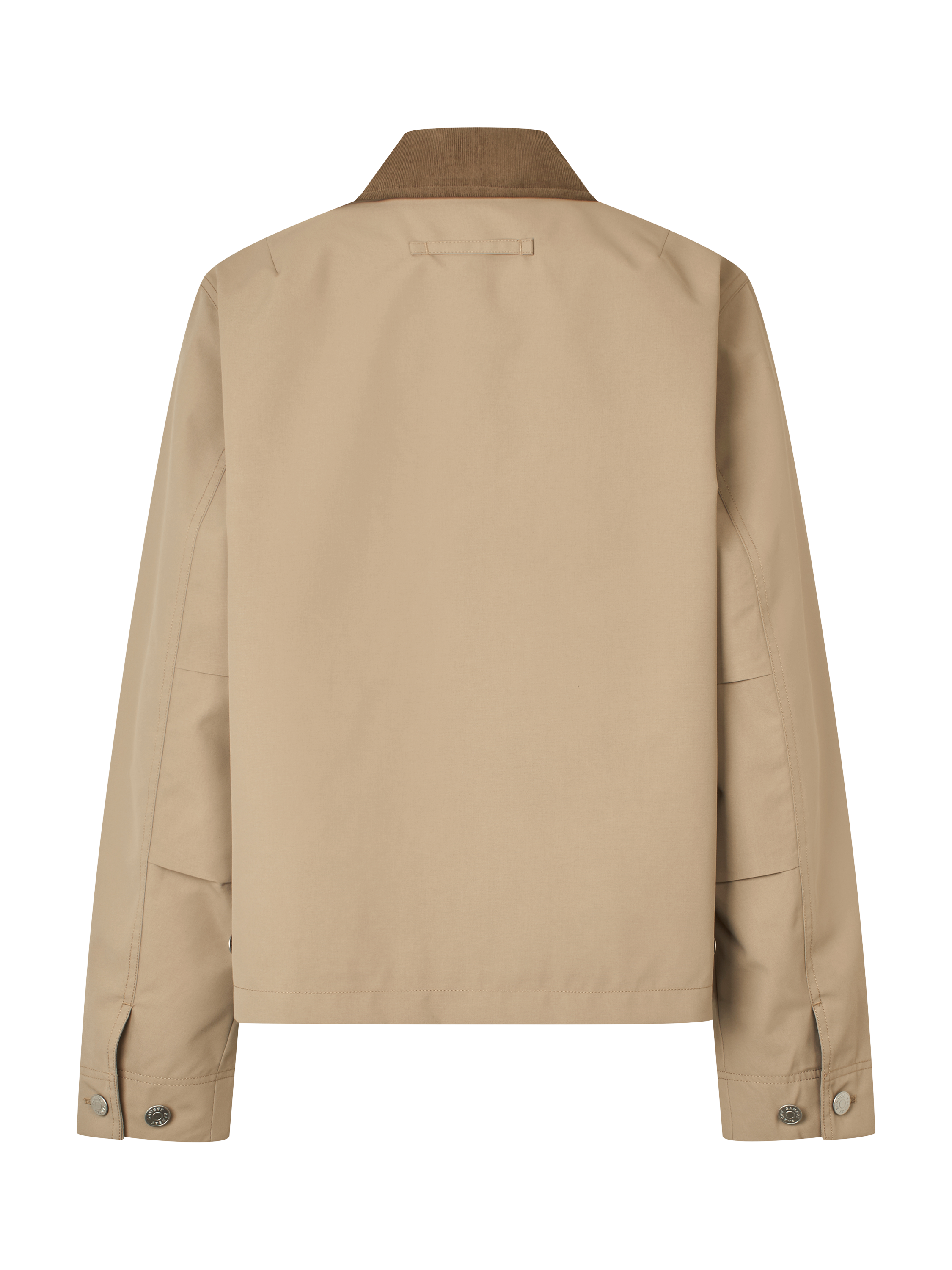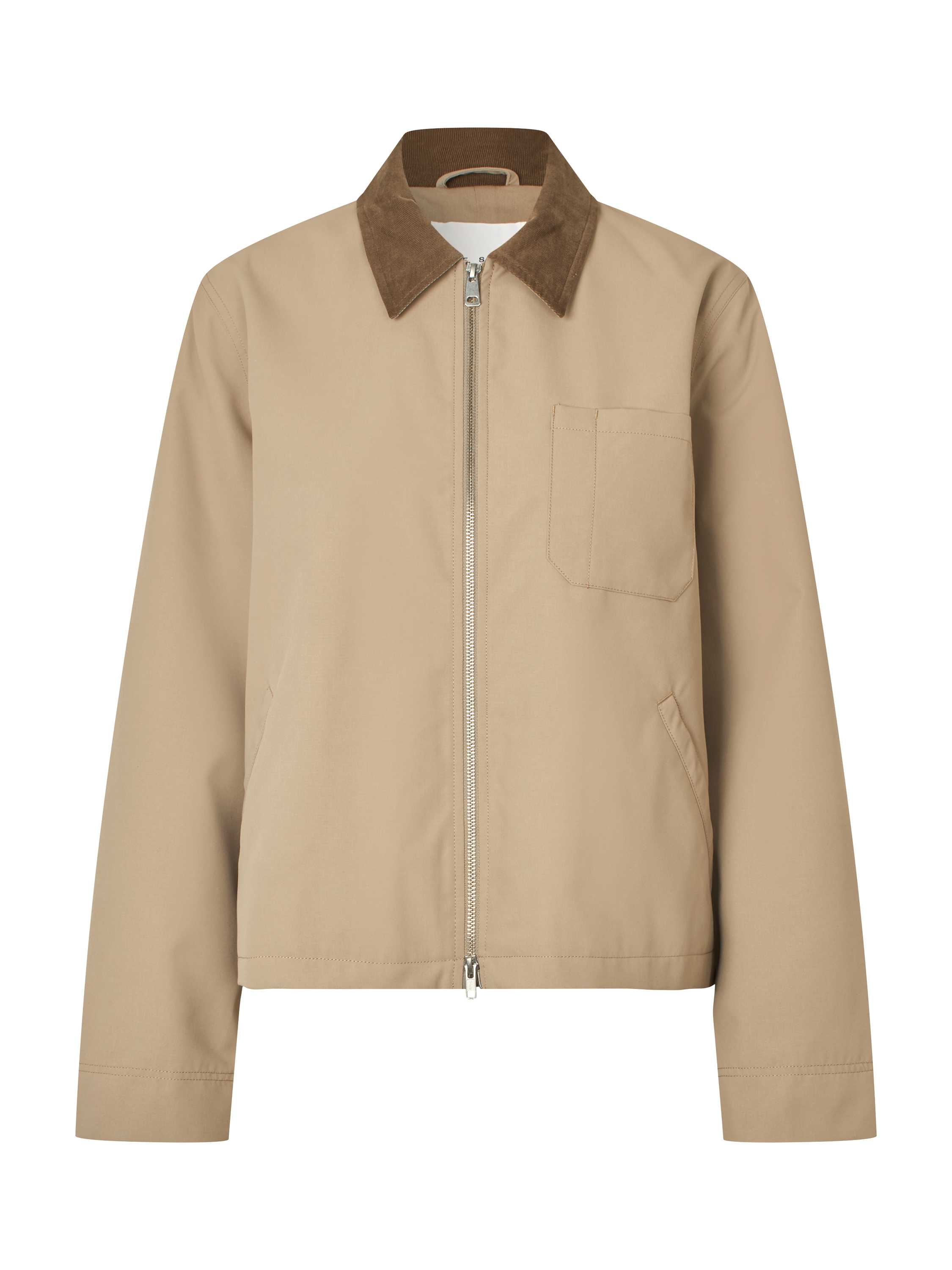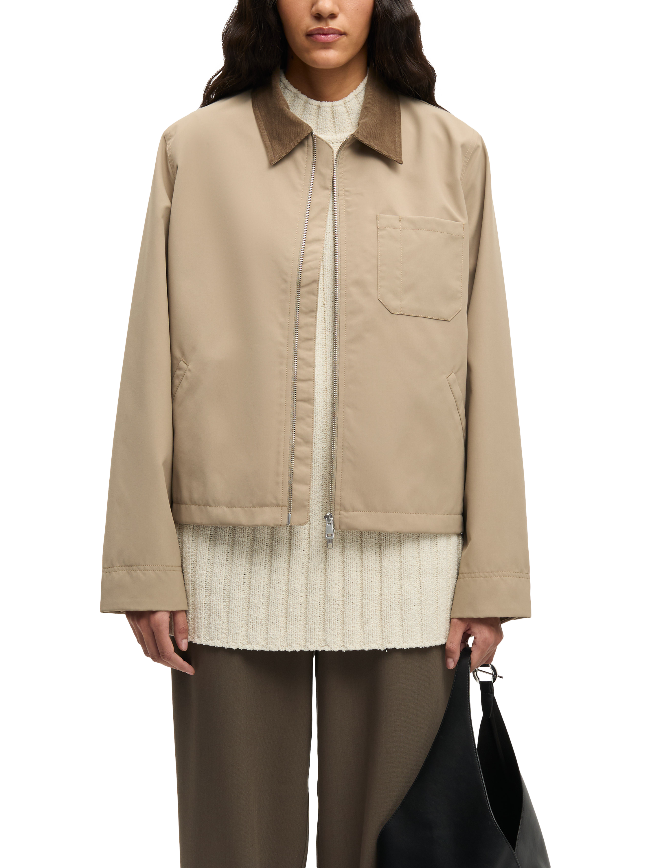 Jacket with a regular fit. Zipper closure on the front. Contrast cotton pointed collar, buttoned cuffs, and straight hem with adjustable side tabs. Patch pocket at the chest and slanted welt pockets on the front. Logo-branded patch at the back of the neck. Main lining made from 100% cotton. Main material made from 100% polyester.