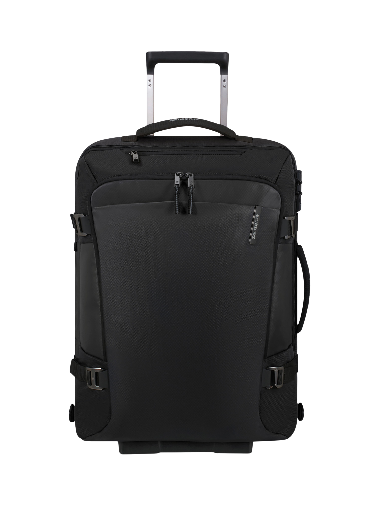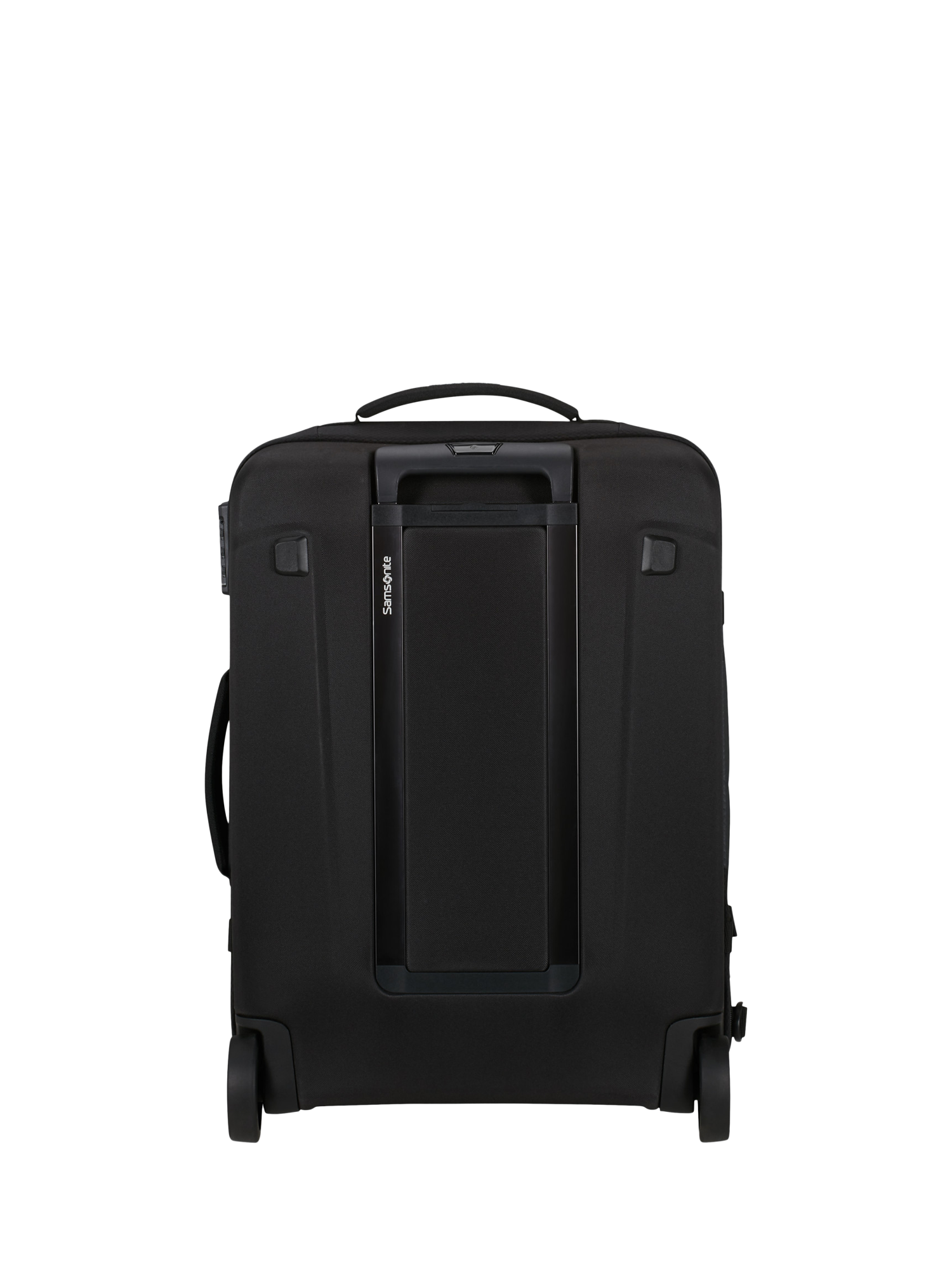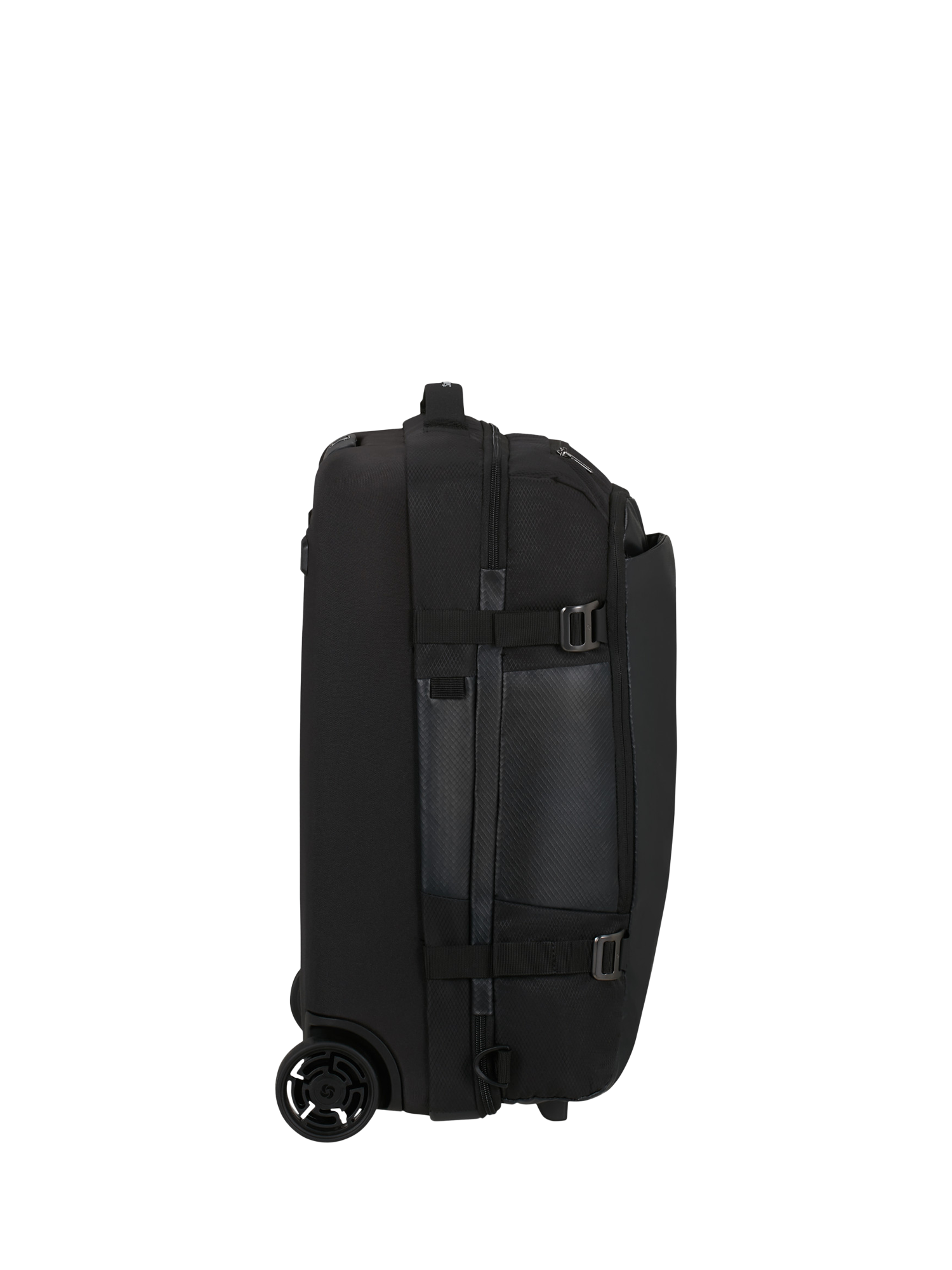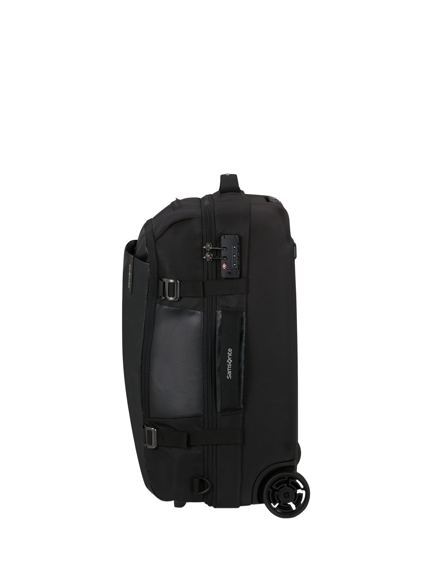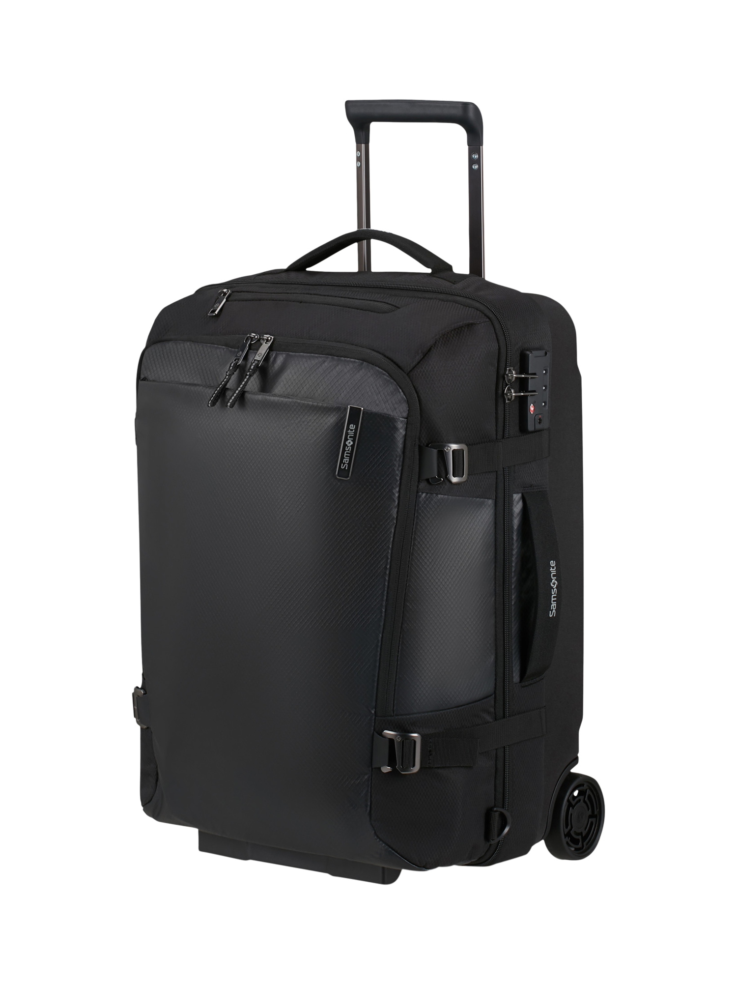 This cabin-sized duffel bag has two shock-absorbing and noise-reducing suspension wheels and a telescopic handle for easy transport. Exterior pockets and internal organisation keep your clothes and essentials at their best. The combination lock is TSA-approved for peace of mind.
