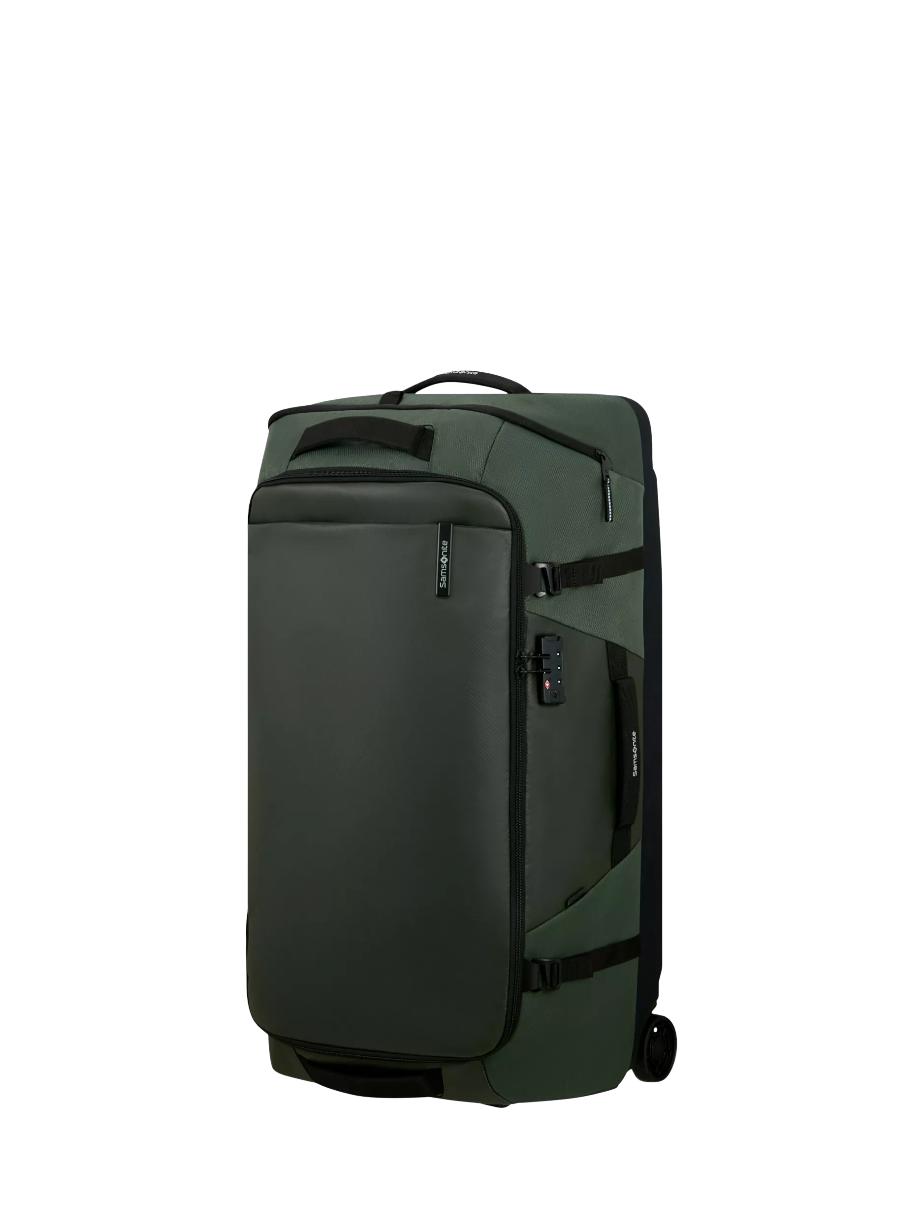 This extra-large duffel bag has two shock-absorbing and noise-reducing suspension wheels and a telescopic handle for easy transport. Exterior pockets and internal organisation keep your clothes and essentials at their best. The combination lock is TSA-approved for peace of mind.