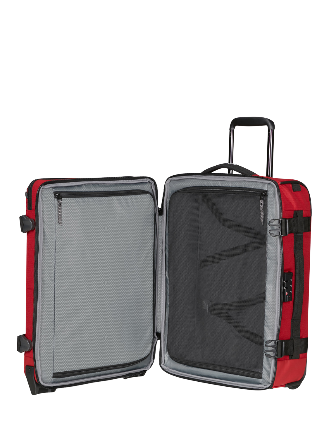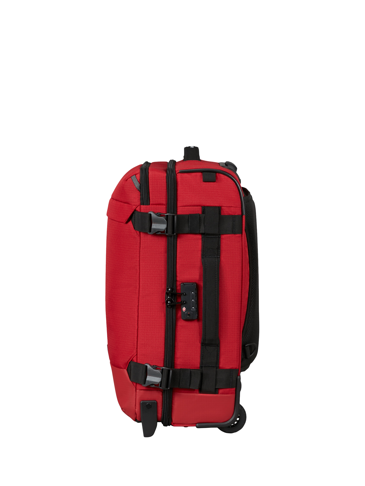 This cabin-sized duffel bag comes with ergonomic backpack straps for versatile carrying, two sturdy and silent wheels and a telescopic handle for easy transport. An exterior front pocket and internal organisation keep your clothes and essentials at their best. The combination lock is TSA-approved for peace of mind.