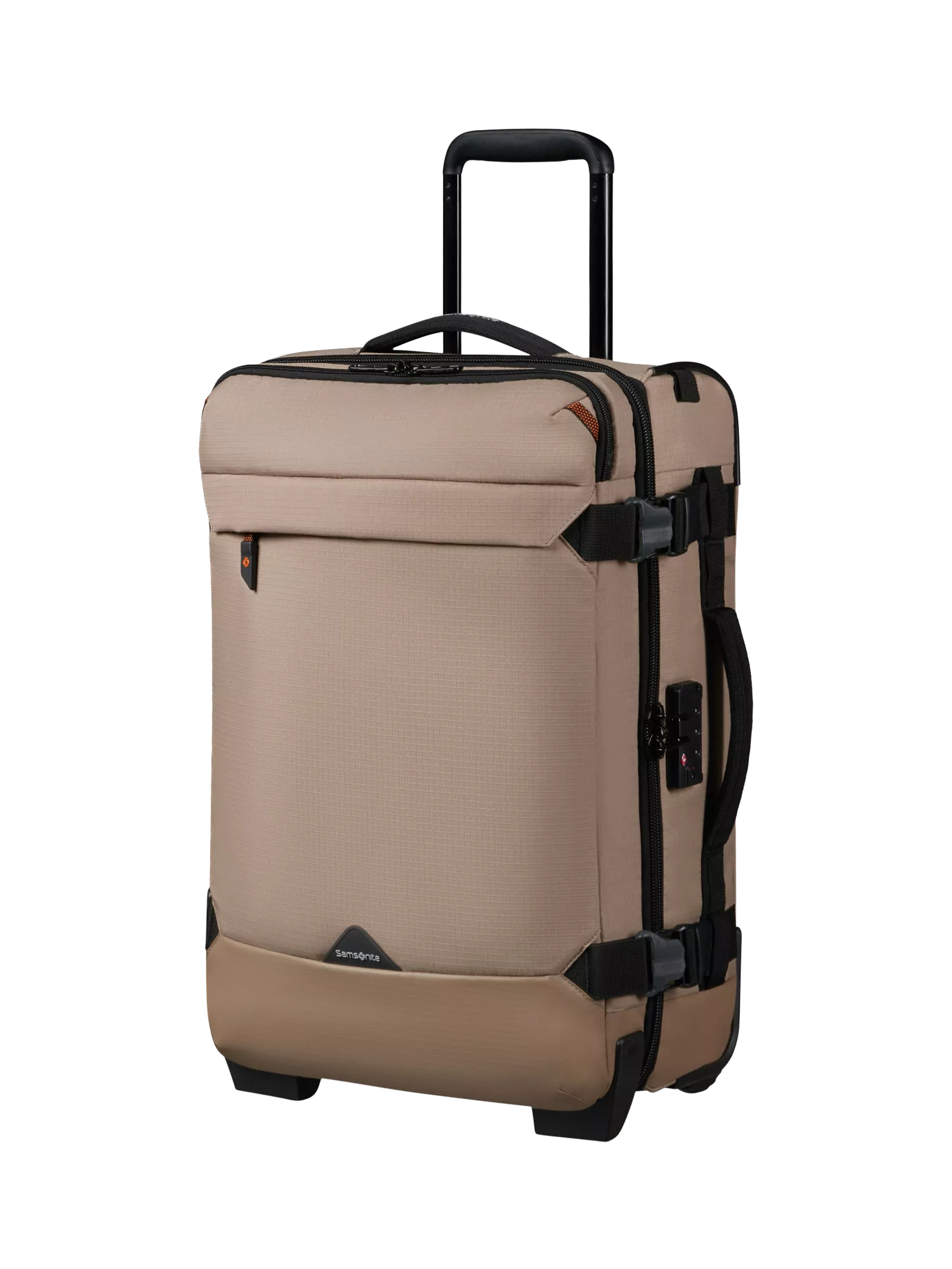 This cabin-sized duffel bag has two sturdy and silent wheels and a telescopic handle for easy transport. An exterior front pocket and internal organisation keep your clothes and essentials at their best. The combination lock is TSA-approved for peace of mind.