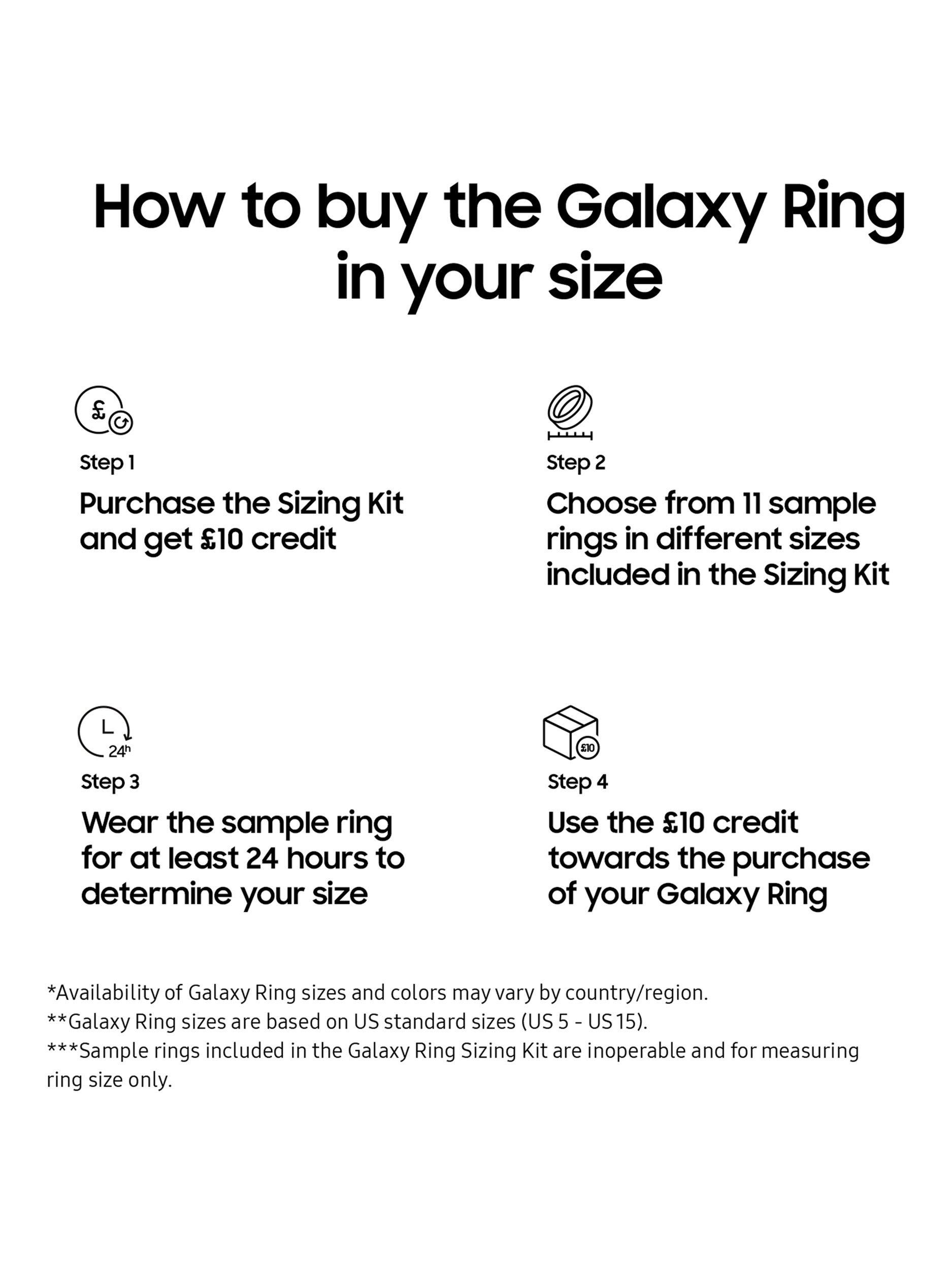 Galaxy Ring sizes may be different from regular ring sizes, so find the right fit with this Sizing Kit. Purchase the Sizing Kit for £10, which includes 11 sample rings to try on and £10 credit towards the purchase of the Galaxy Ring.