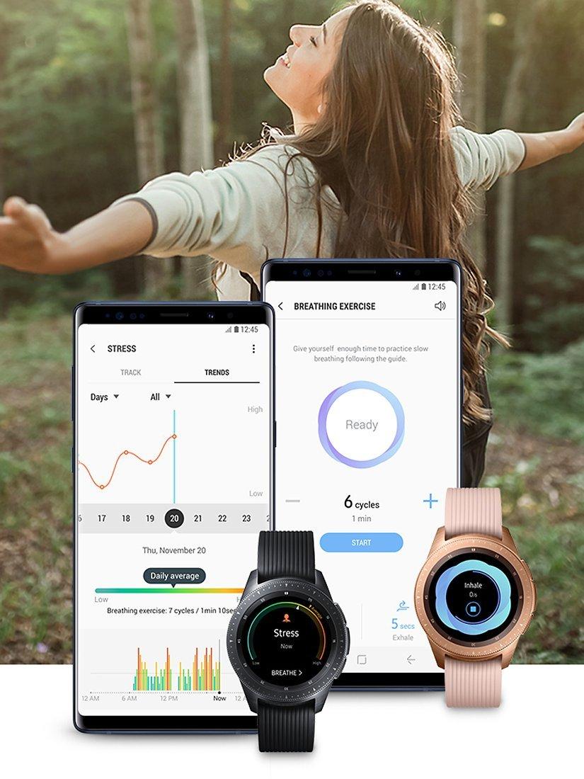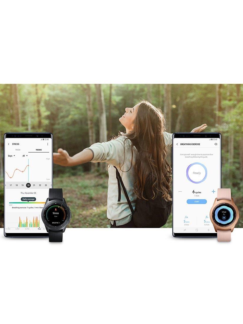 The Galaxy Watch can track up to 40 different exercises, allowing you to make the most of your workout. Move from hitting the gym to the park and to the pool and it’ll help you achieve your goals. Track your heart rate while out for a run, following your route using the built-in GPS, and manage your health stats, nutritional goals and the calories you’re burning. When you wake up, it can intelligently analyse how you slept to help find the best routine for you. And of course, it syncs seamlessly to Samsung Health across all your devices. With technology this effortless, all your focus can be kept on your wellness.