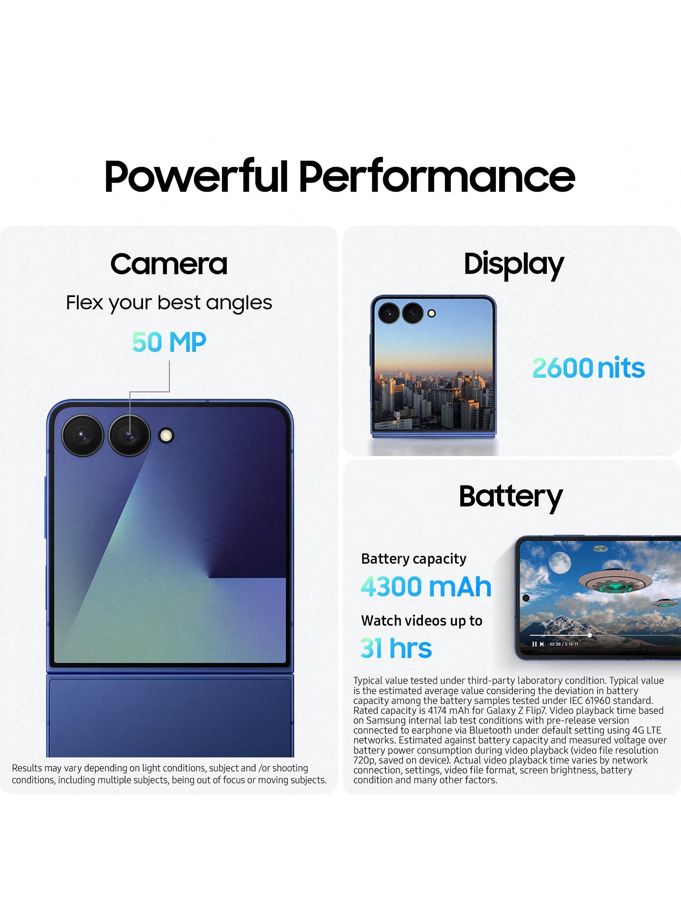 [3] Typical value tested under third party laboratory conditions. Rated minimum capacity of Galaxy Z Flip7 is 3,900mAh.