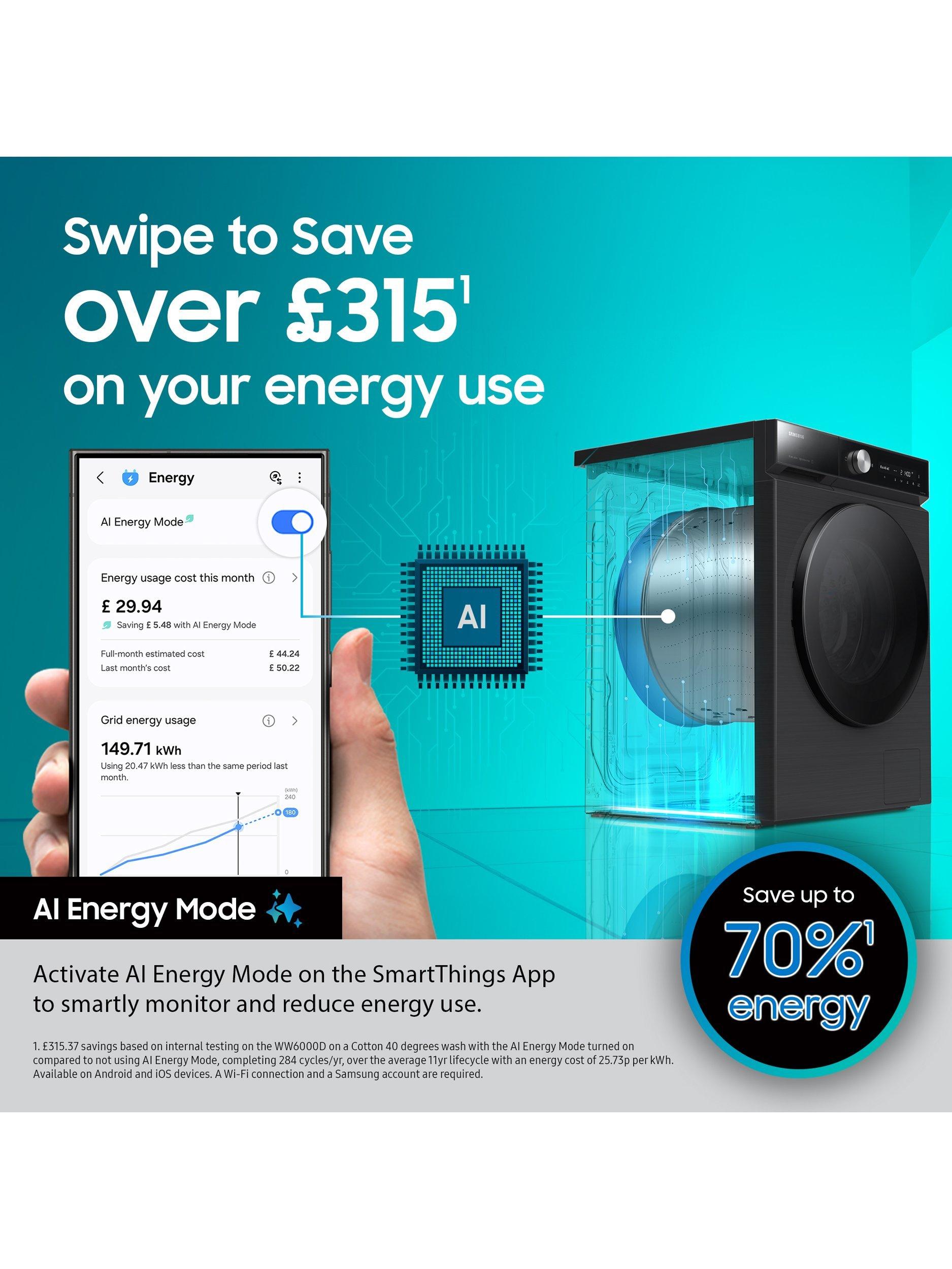 *Based on internal testing on the WW11BB944AGB model on a Cotton 40-degree wash with AI Energy Mode turned on, compared to not using AI Energy Mode.