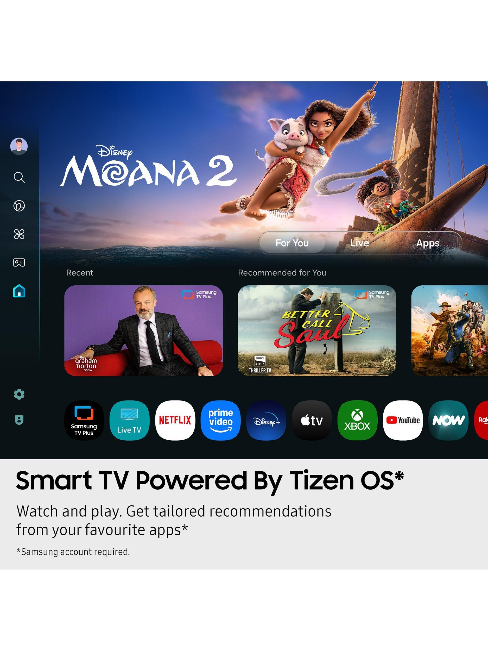 Powered by Tizen, Samsung's smart platform gives you access to a huge collection of 4K content, and all your catch-up TV apps including BBC iPlayer, Netflix, Disney+, YouTube, Xbox, and more, all in one place.*