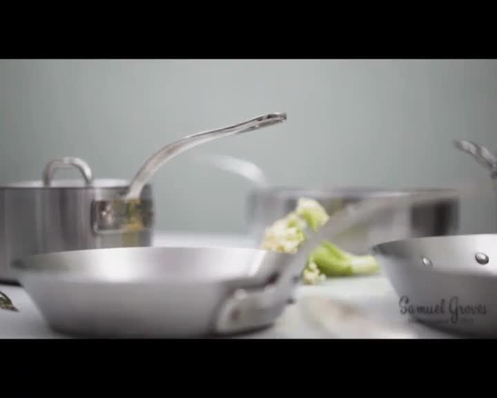 The premium tri-ply stainless steel range from Samuel Groves is the heaviest tri-ply on the market with a robust 3mm body. Every pan is handcrafted in the UK, in the heart of the industrial midlands. The cookware has a brushed stainless steel exterior and interior, sandwiching an aluminium core that provides excellent heat conductivity and heat distribution for even cooking.