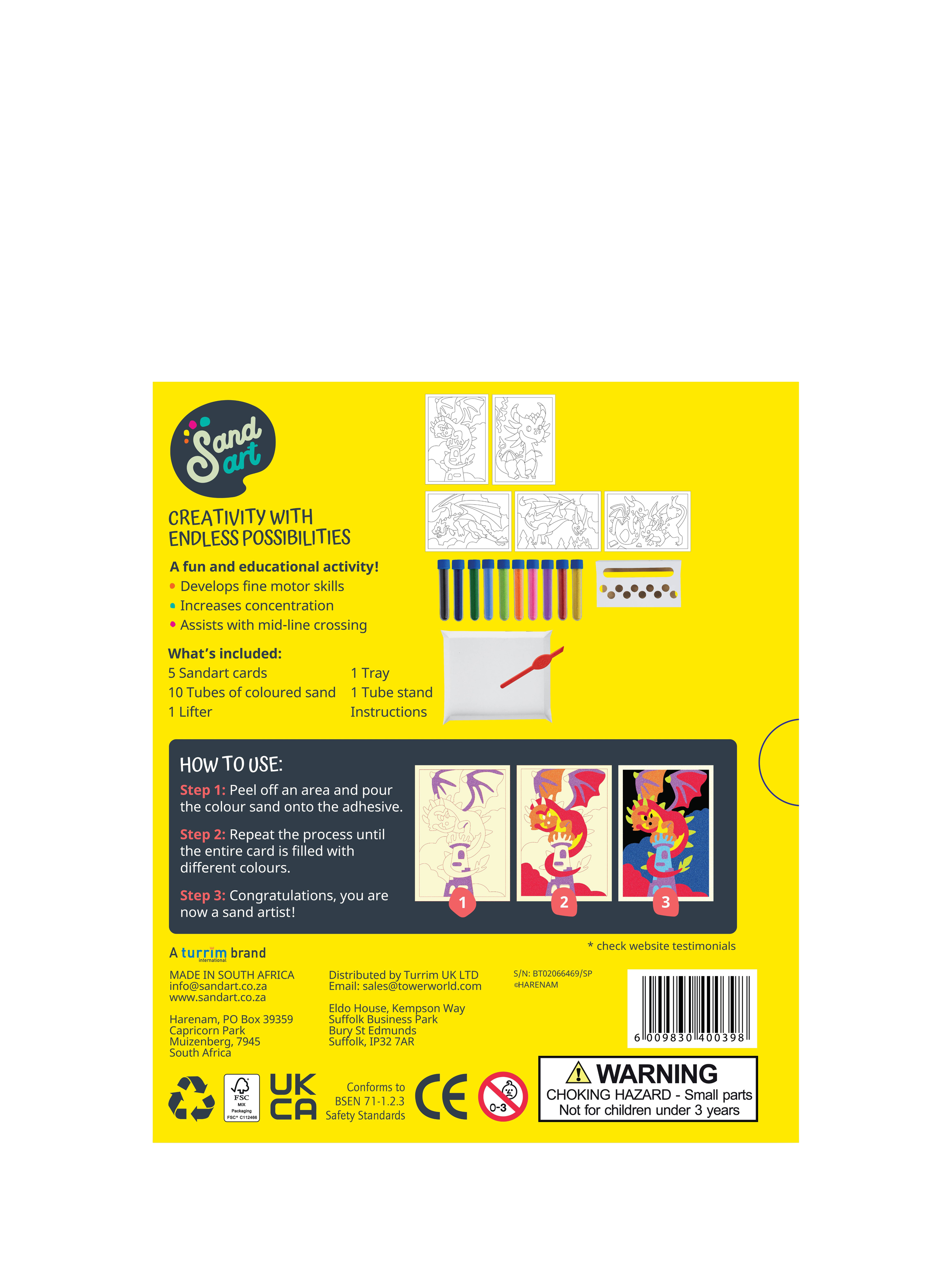 - 5 Pre-cut cards, 10 plastic tubes of Neon Coloured Sand, 1 picker, 1 cardboard tray