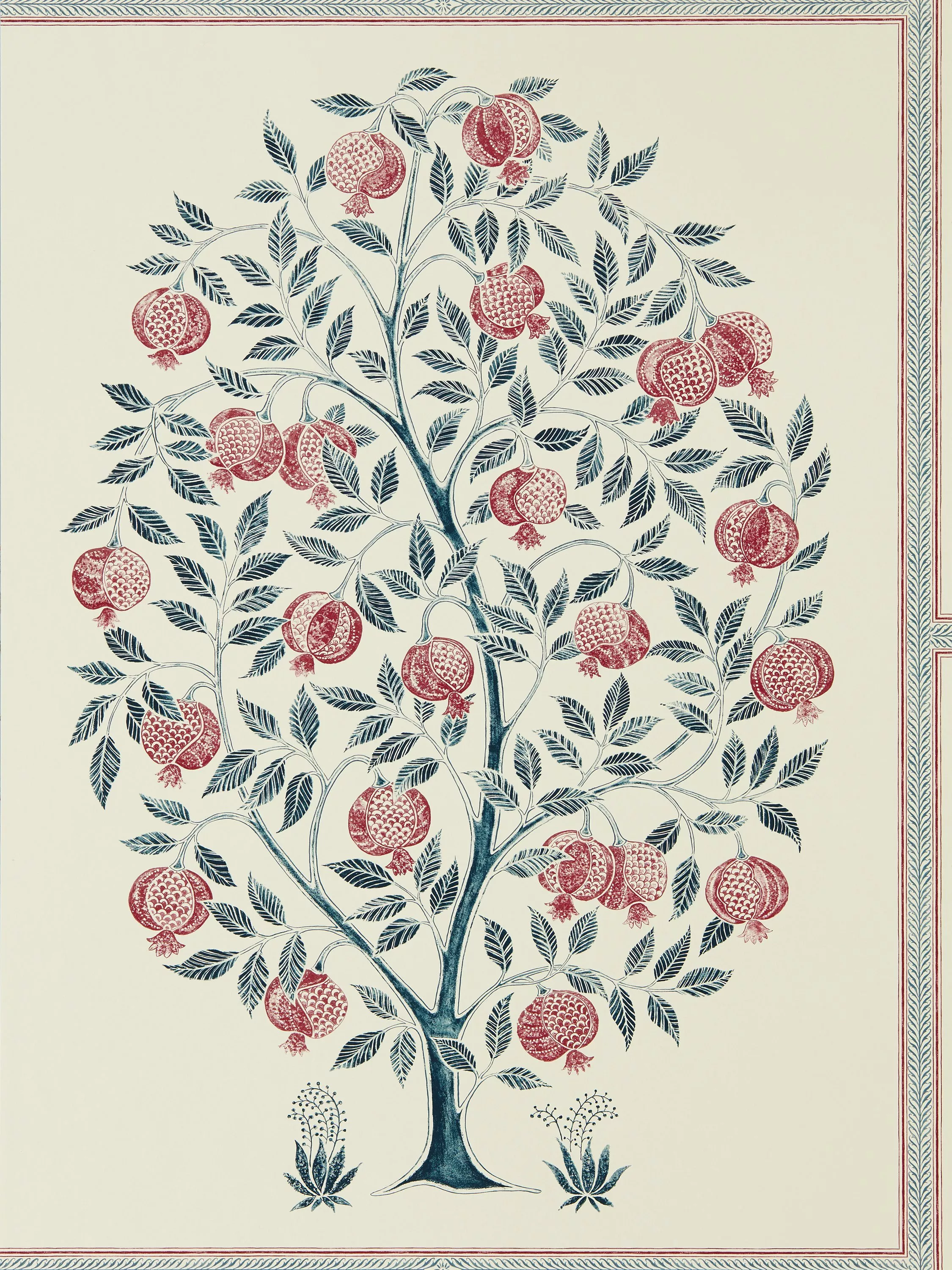 This beautifully proportioned pomegranate tree wallpaper is hand-drawn and edged with a fine decorative border. A repeating half drop creates a striking picture frame effect and a hand-printed look adds textural detail to this wide width design.