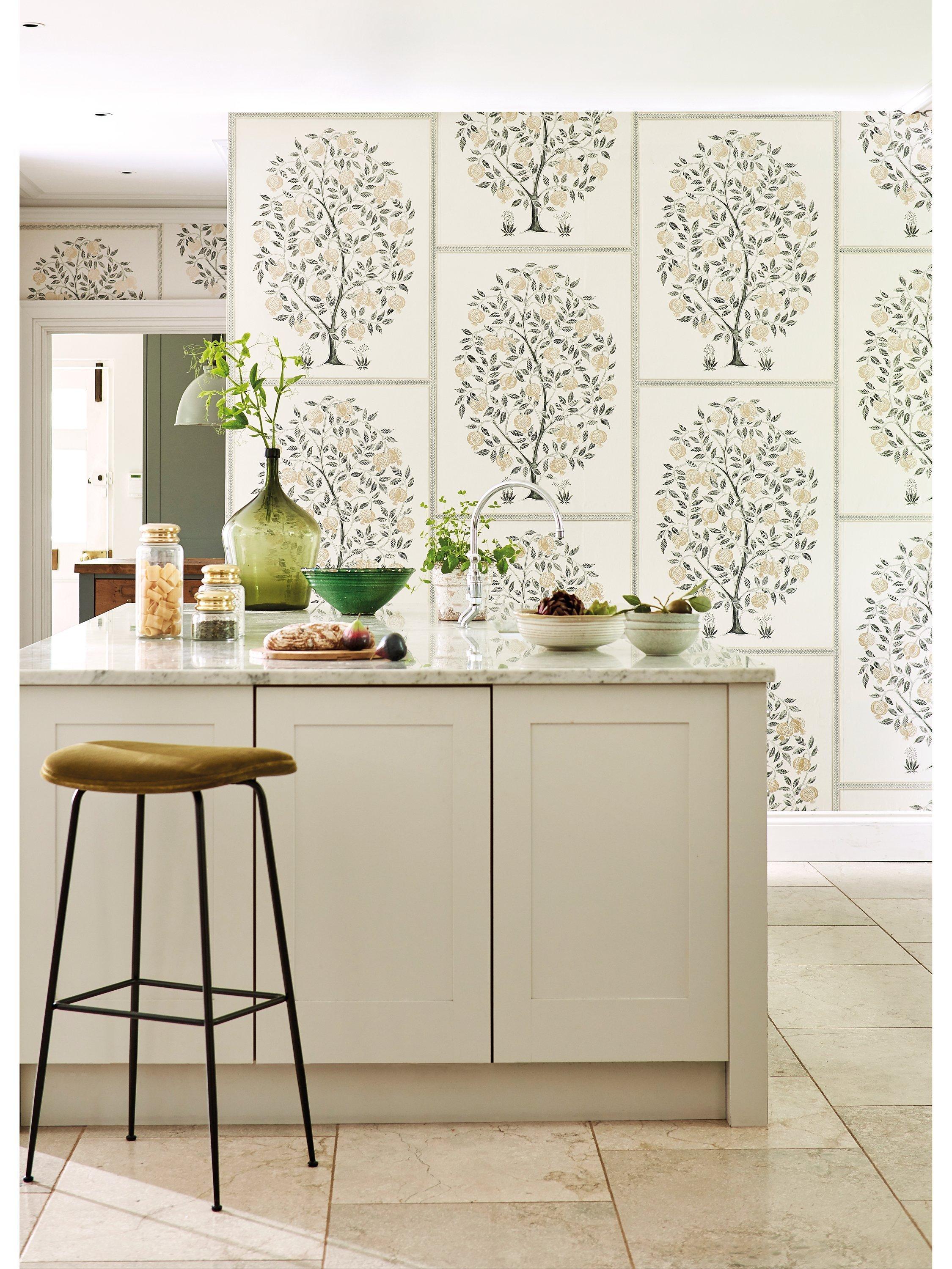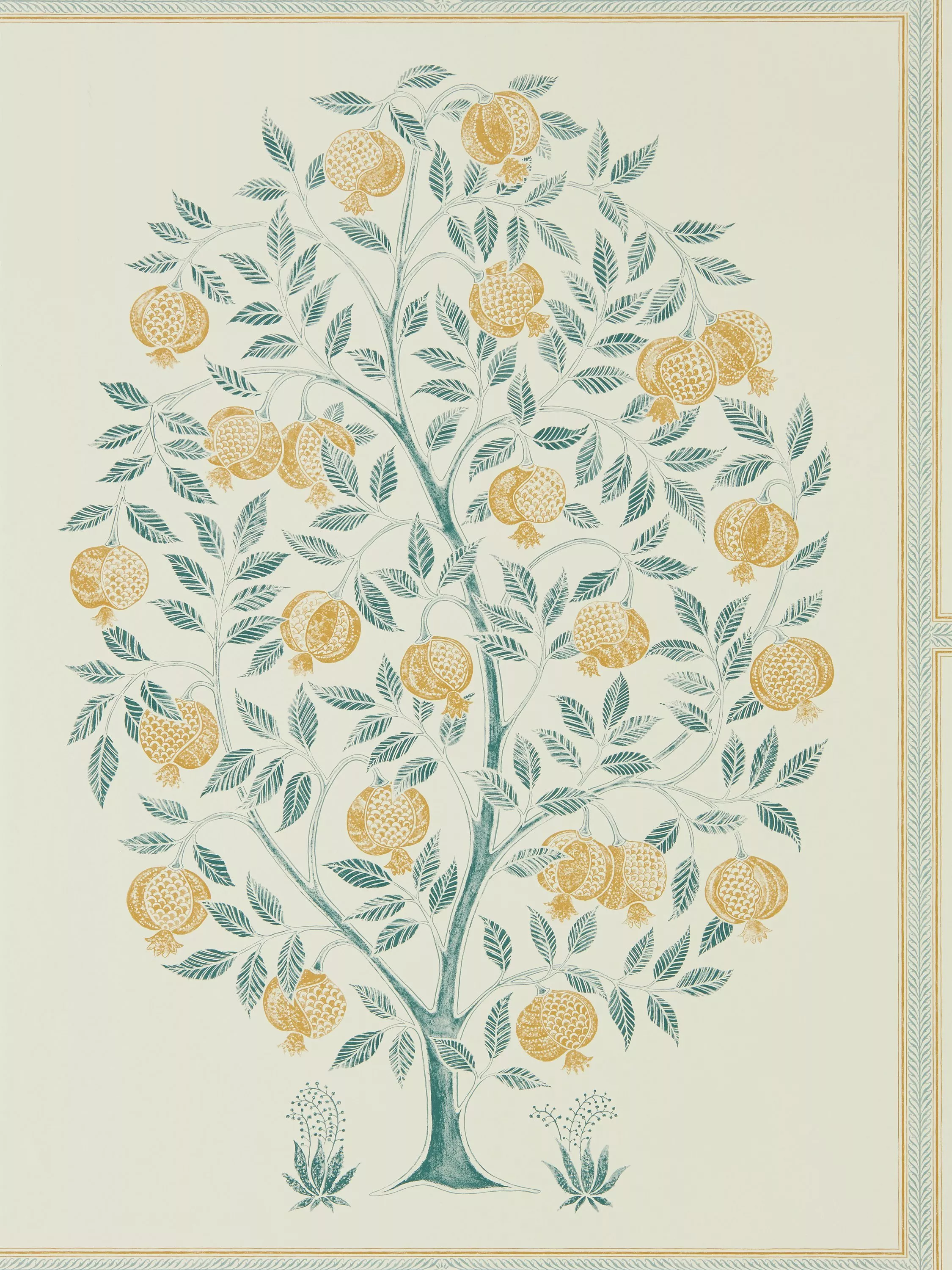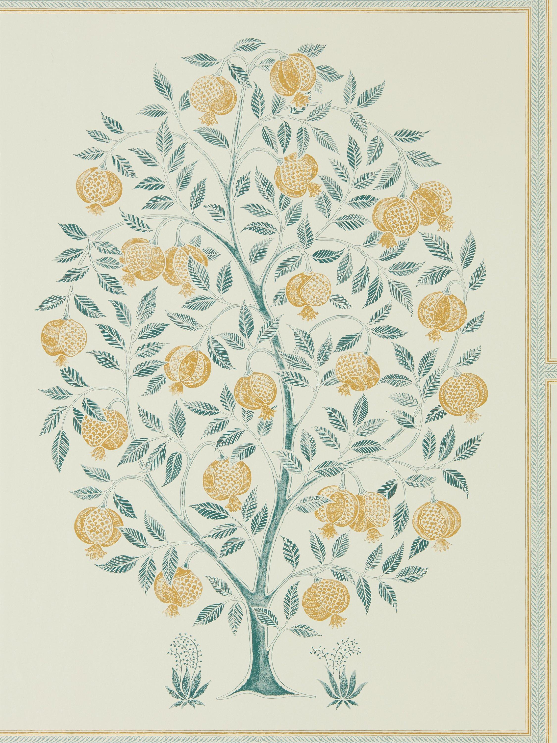 This beautifully proportioned pomegranate tree wallpaper is hand-drawn and edged with a fine decorative border. A repeating half drop creates a striking picture frame effect and a hand-printed look adds textural detail to this wide width design.
