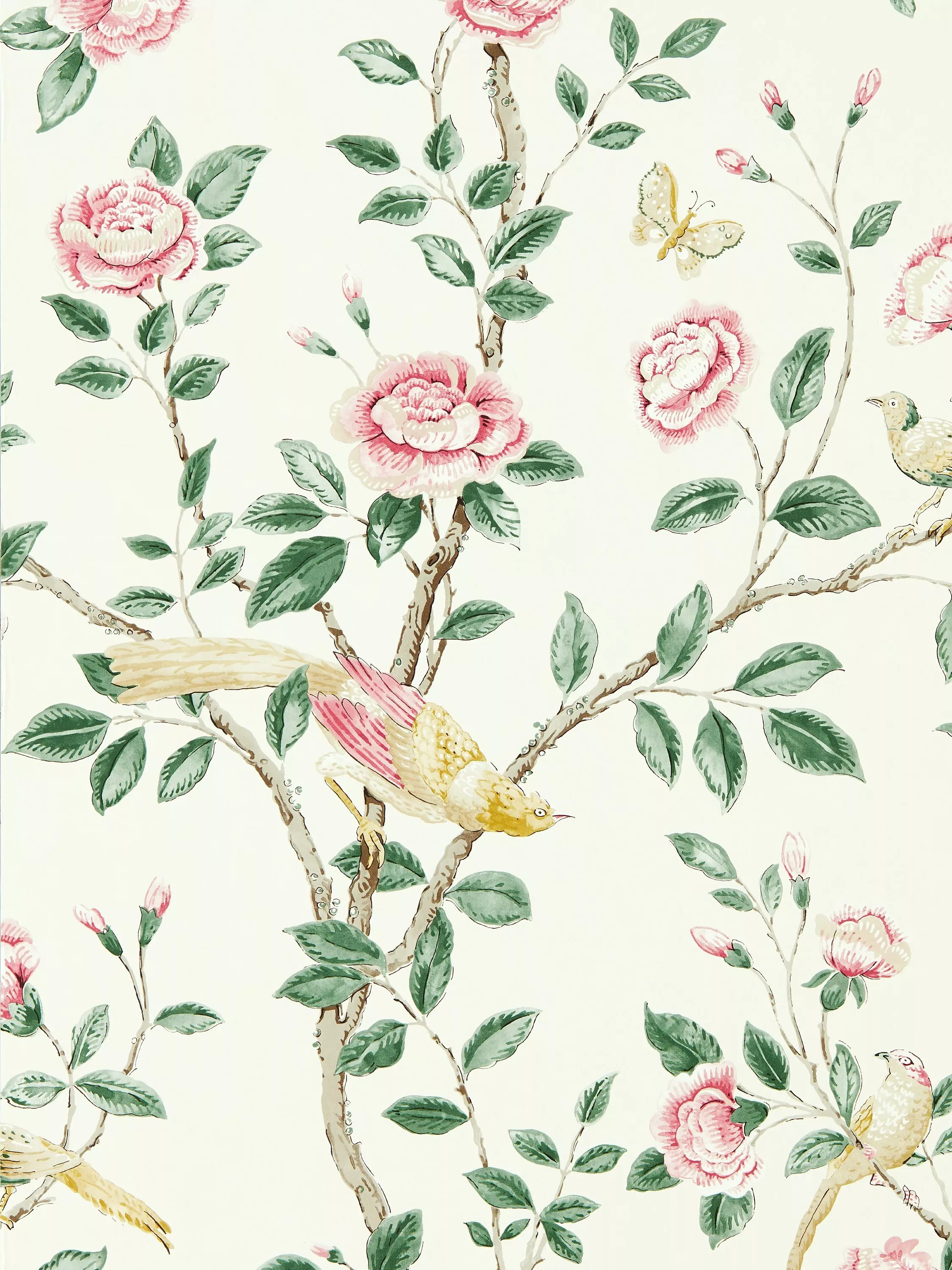 A Sanderson classic, this archive wallpaper features birds of paradise, delicate dragonflies, plump peonies and dainty butterflies. They've have been repainted by hand, showing a lovely gradation of colour across a textural, mottled ground.