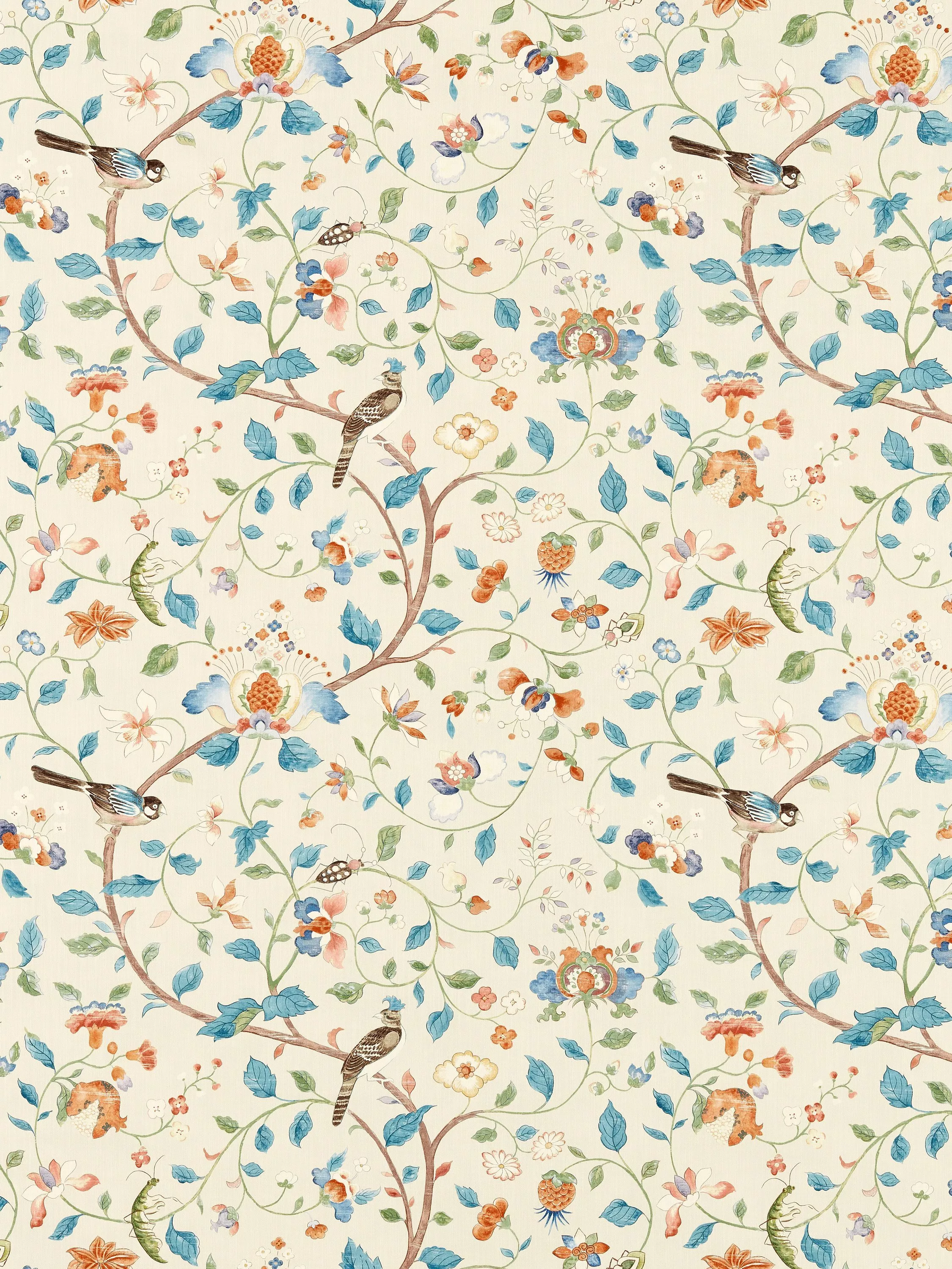 Named after a pomegranate's delicious jewel-coloured treasures and painted in a style reminiscent of indiennes, Sanderson's trailing garden design features stylised flowers, a friendly grasshopper, beetles and a crested tit.