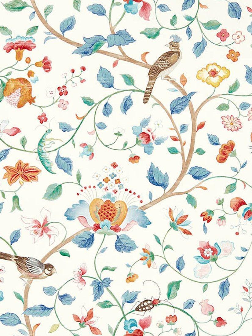 Named after a pomegranate's delicious jewel-coloured treasures, this trailing garden design features stylised flowers, a friendly grasshopper, beetles and a crested tit.