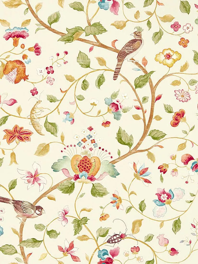 Named after a pomegranate's delicious jewel-coloured treasures, this trailing garden design features stylised flowers, a friendly grasshopper, beetles and a crested tit.