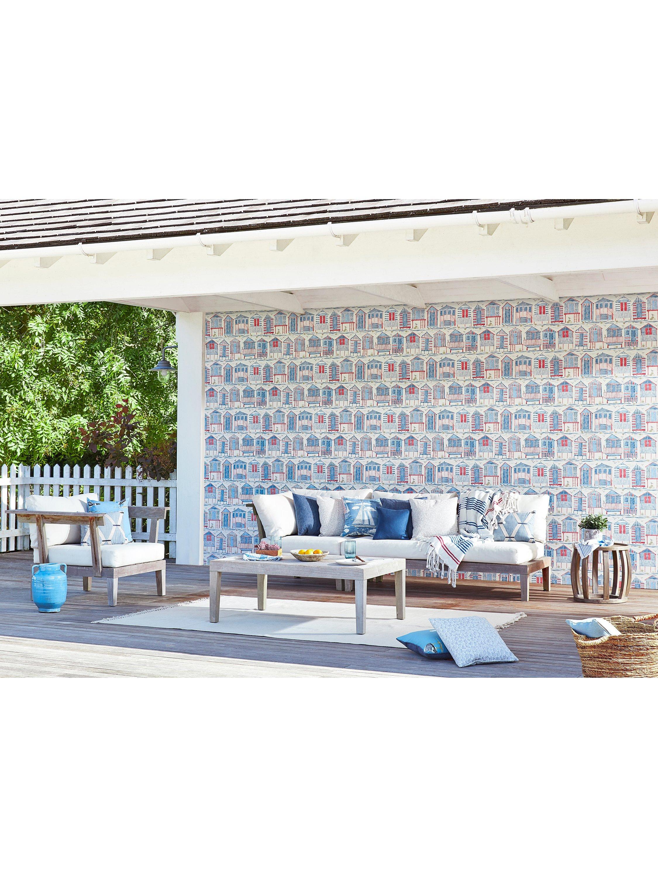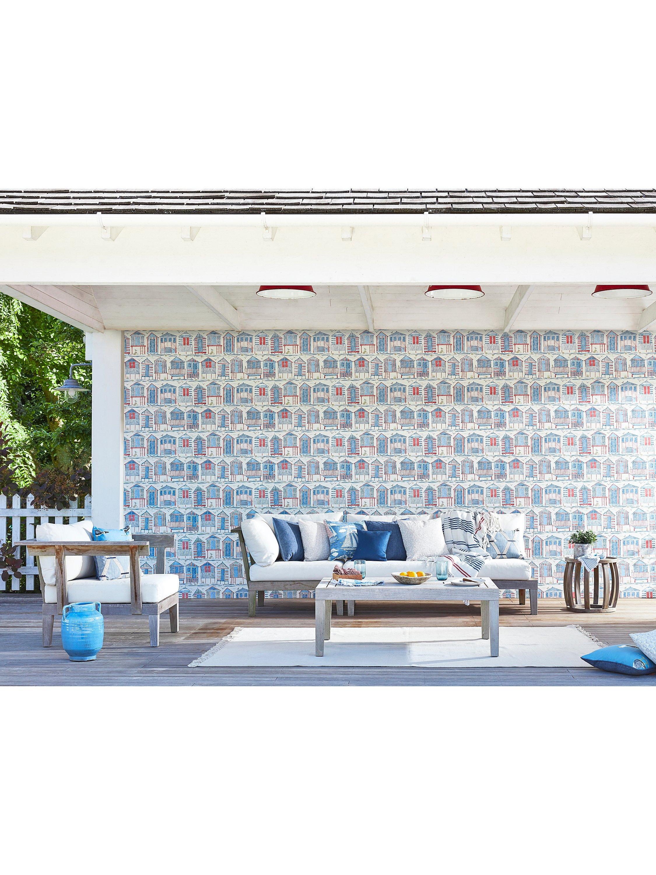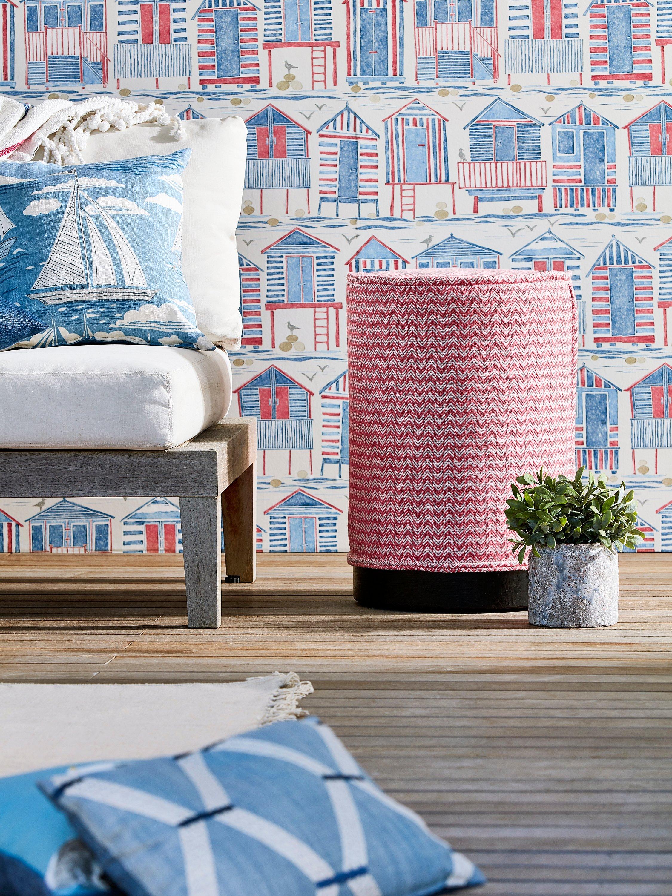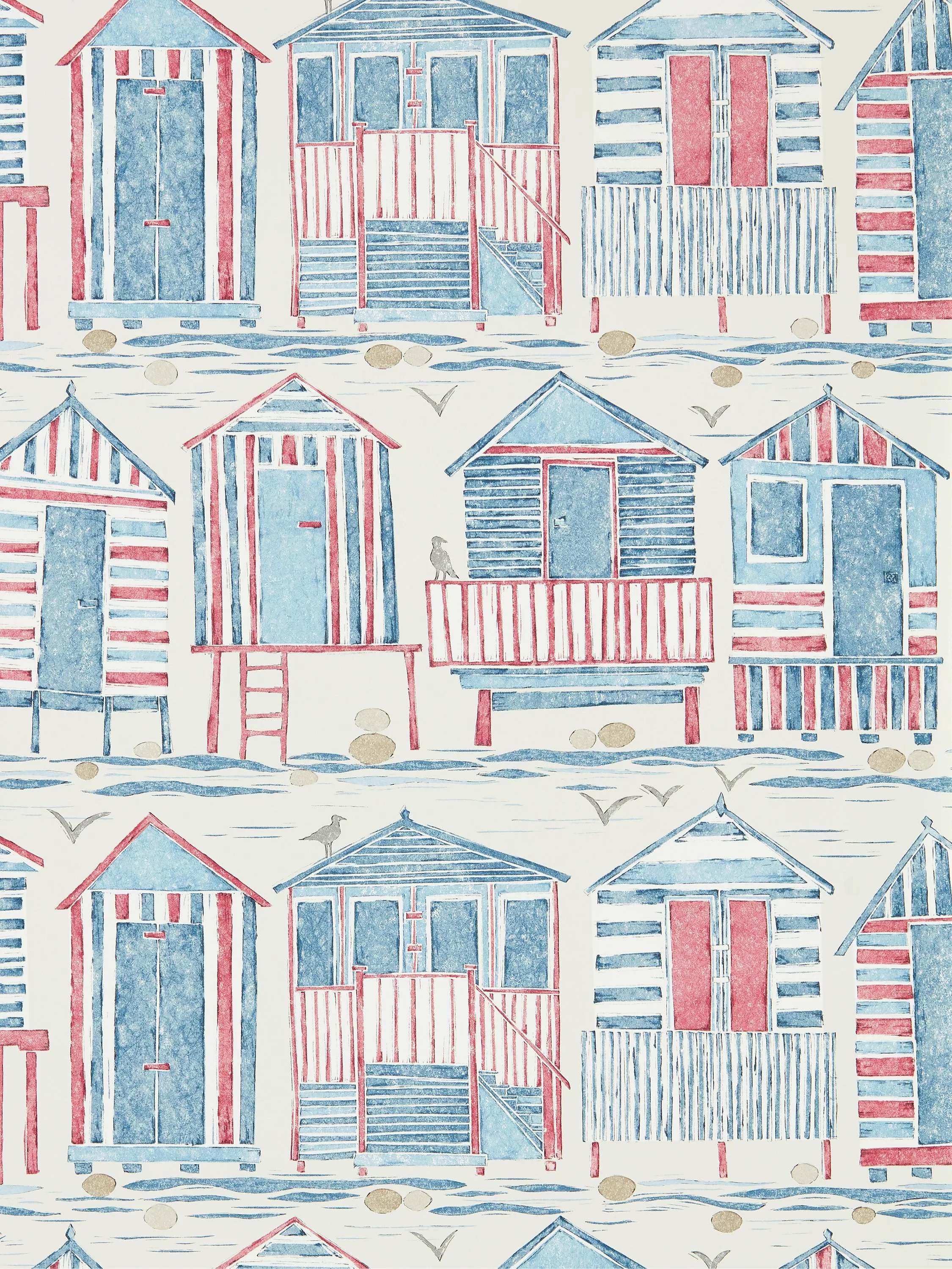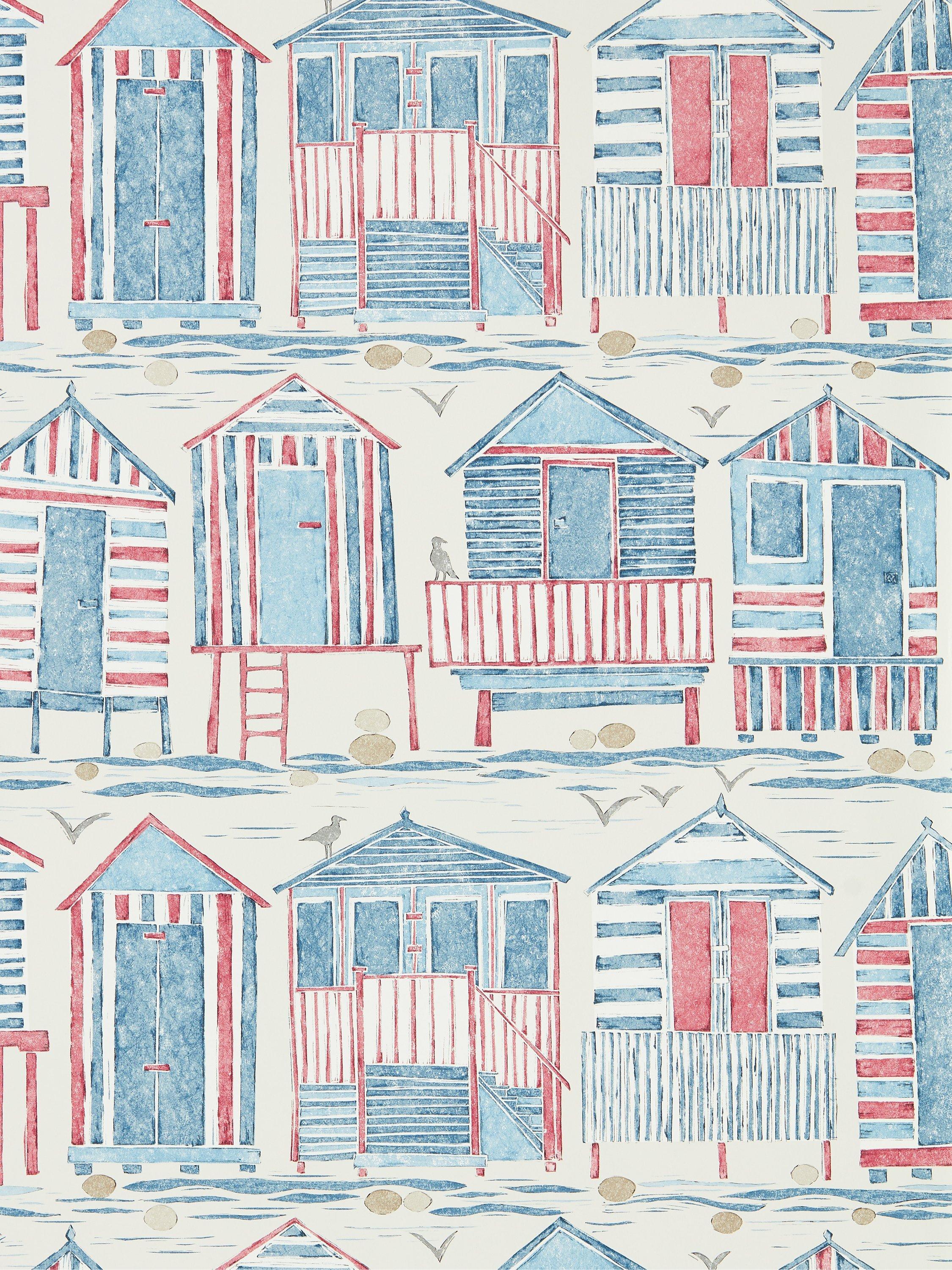 This wallpaper was inspired by the iconic English beach hut. Each hut has been individually crafted using lino printing, with the prints then drawn back using fine liners and pencil to add definition.