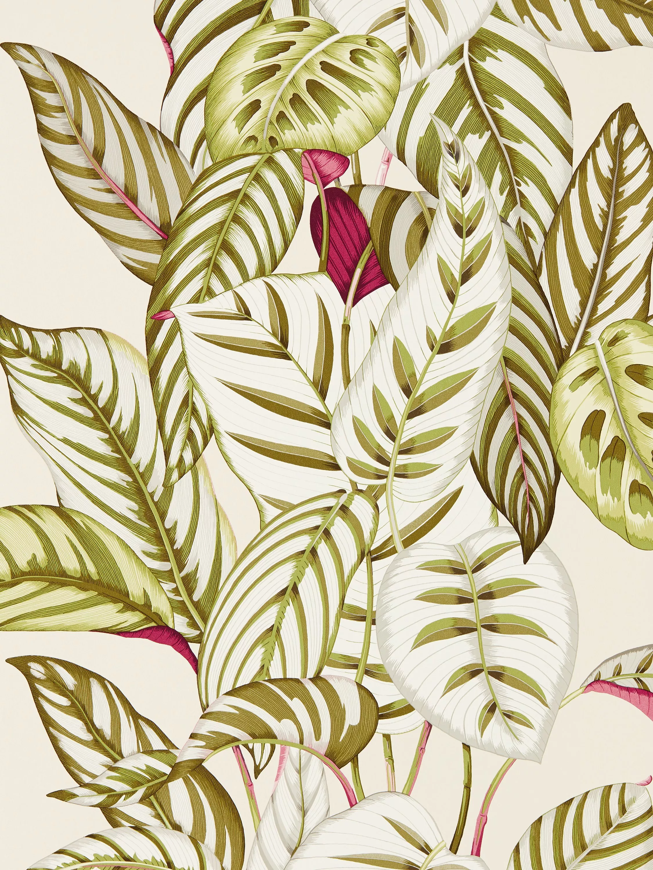 Elegant and strikingly detailed, this wide-width wallpaper from Sanderson creates a striped pillar of abundant tropical leaves across the wall.