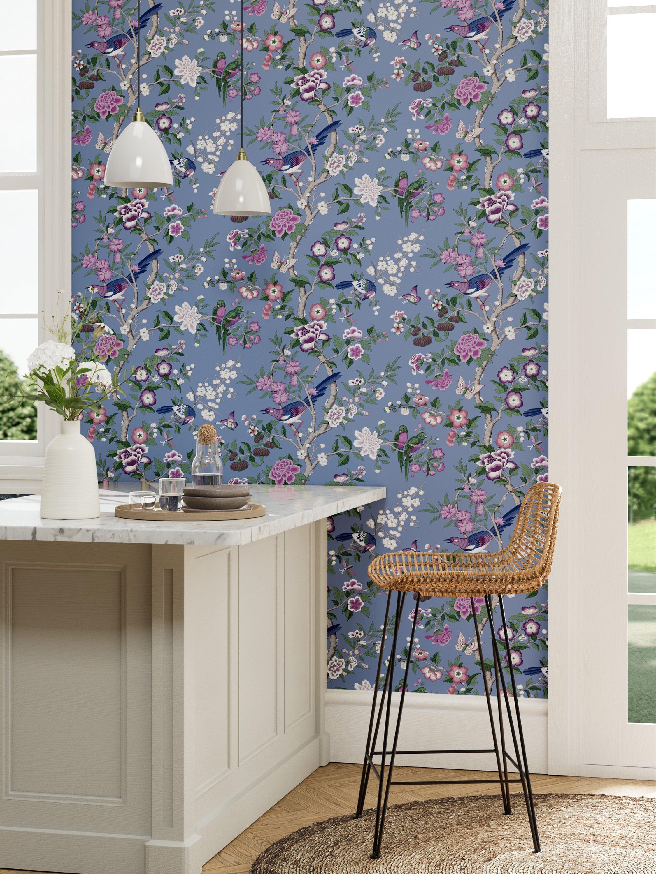 Chinoiserie Hall is inspired by a beautifully coloured archive wallpaper called "Chinese Magpie", believed to be designed by William Turner (1867-1936) and produced by Jeffrey & Co. In this iteration, intricate budgies perch on delicate branches amongst springtime blossom and neat buds.