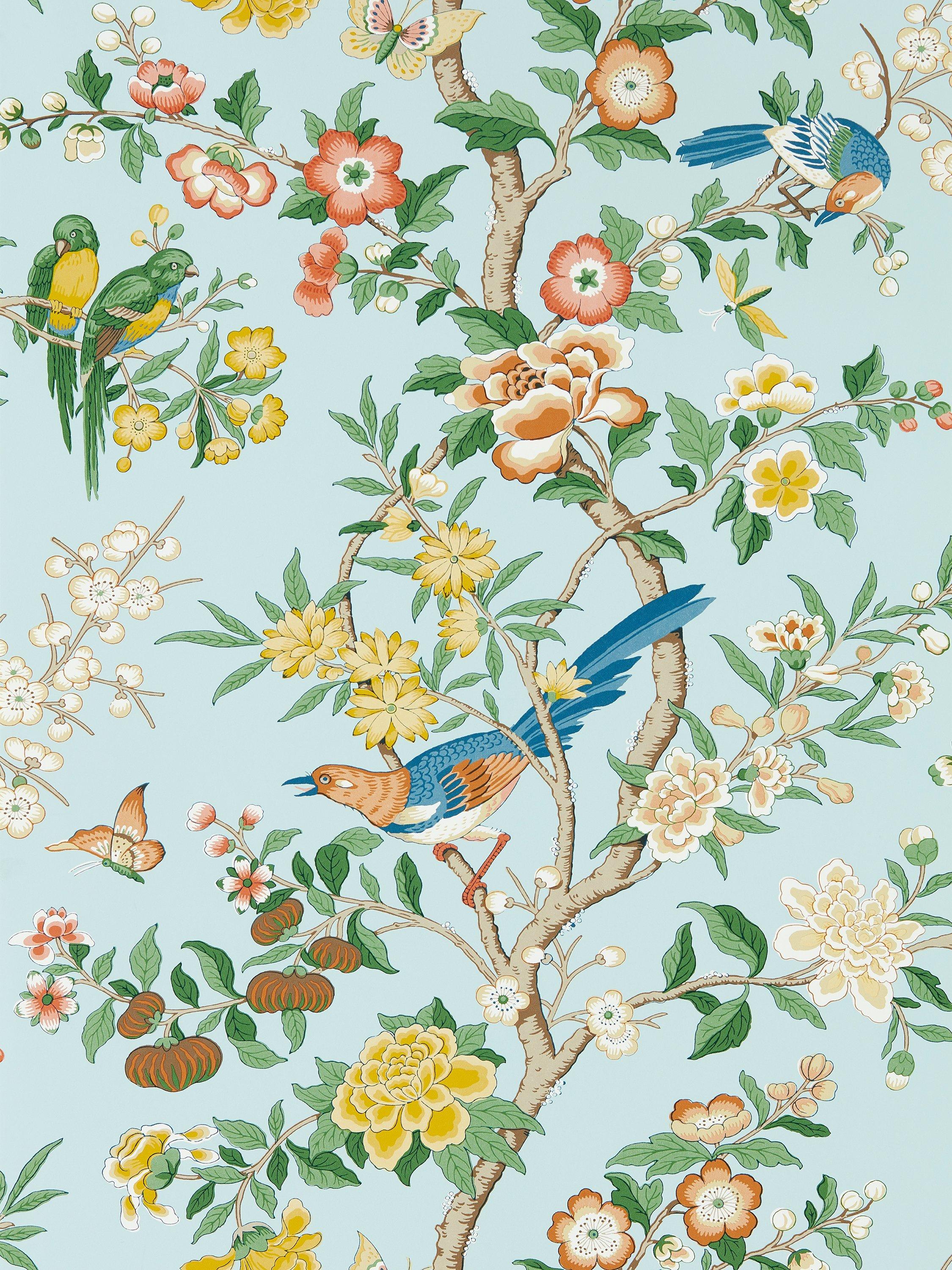 Chinoiserie Hall is inspired by a beautifully coloured archive wallpaper called "Chinese Magpie", believed to be designed by William Turner (1867-1936) and produced by Jeffrey & Co. In this iteration, intricate budgies perch on delicate branches amongst springtime blossom and neat buds.