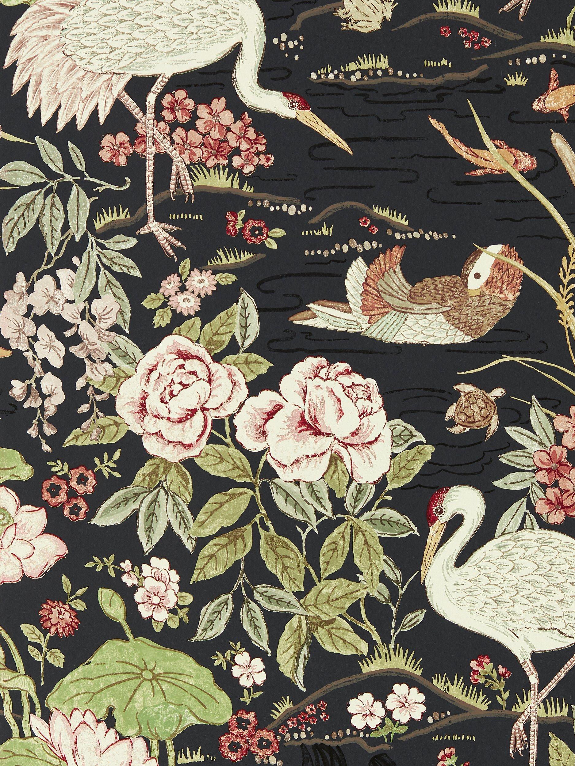 Inspired by a beautiful, painted silk, this wallpaper was designed in the Sanderson studio. Telling a story of English water gardens, Emperor ducks, characterful frogs and regal koi carp, paired with irises and roses to recreate the spirit of the 1930s.