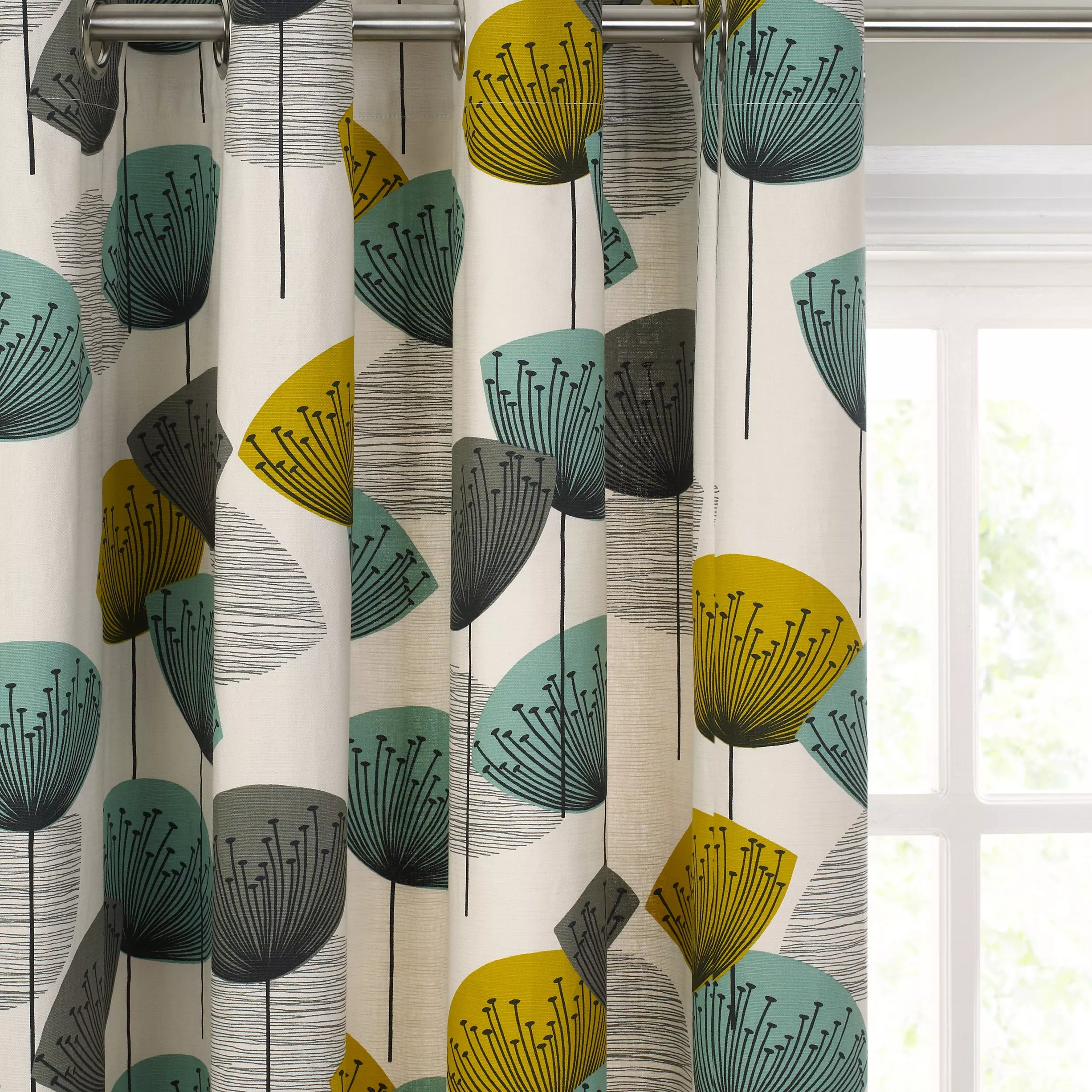 Pleasingly robust pair of lined eyelet curtains featuring a fun and funky 50s retro design, with stylised dandelion flowers in bold colour combinations.