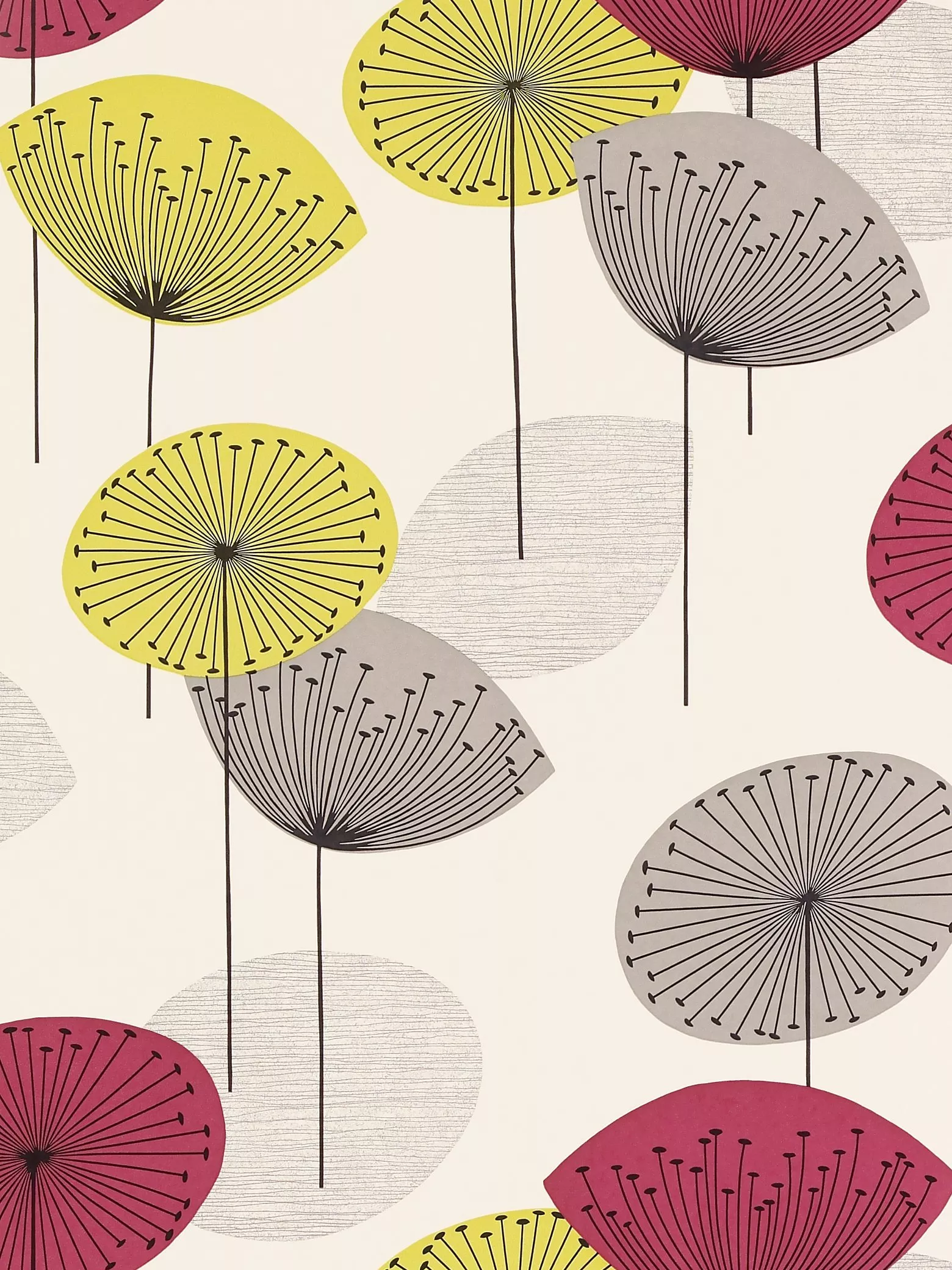 A fun and funky 50s retro design, with stylised dandelion flowers in a bold, pink/yellow colour combination.
