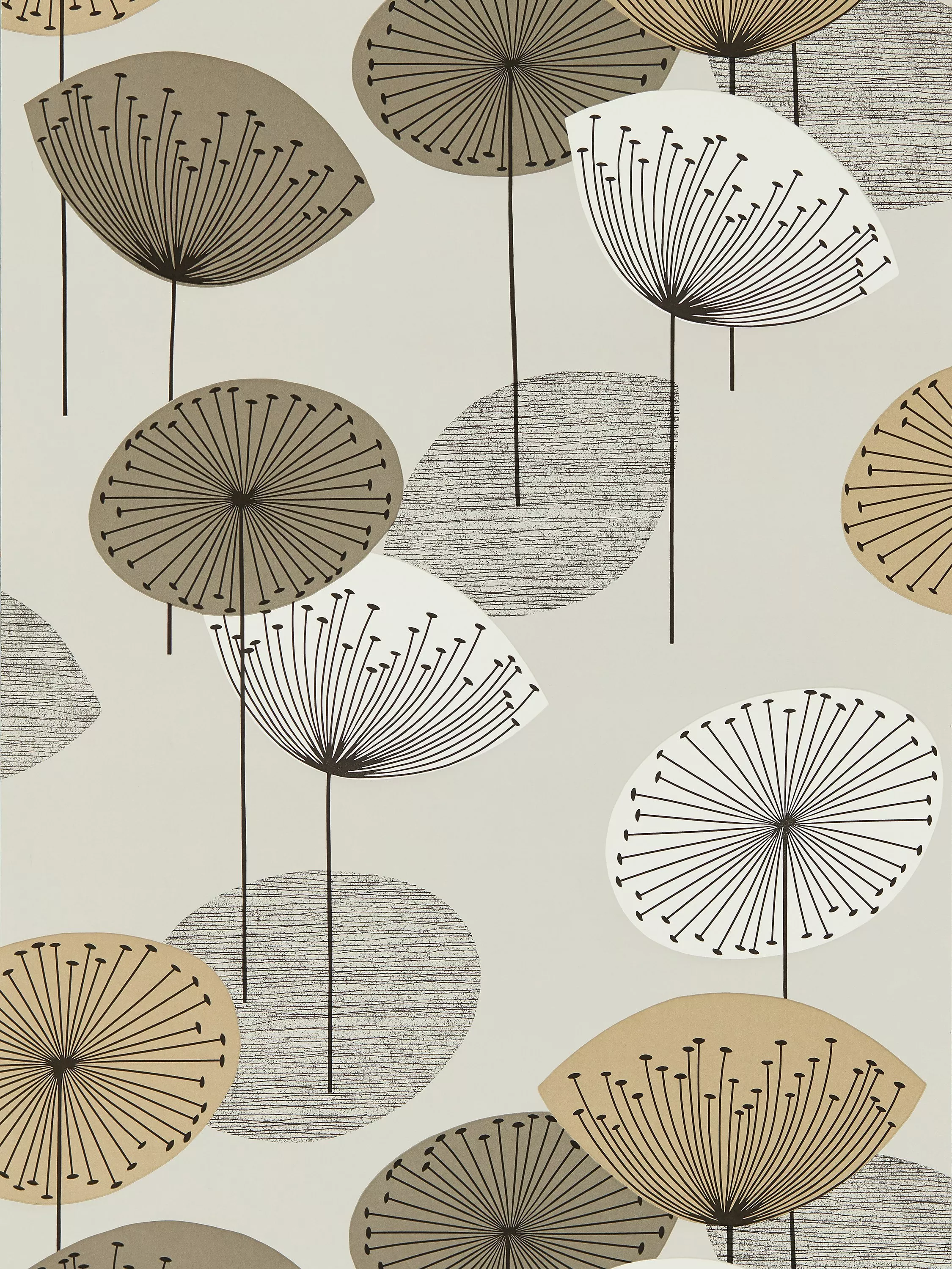 A fun 50s retro pattern, which features stylised dandelion heads with seeds radiating from a central point.