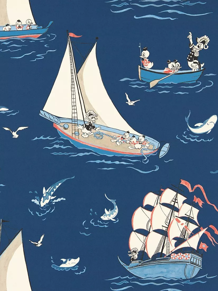 Disney`s Donald Duck is joined by nephews Huey Dewey and Louie Duck as they voyage across the seven seas. Created from original Disney style guides and animation stills, hand-painted rowing boats yachts and galleons are flanked by sharks and seagulls in this delightful nautical design.