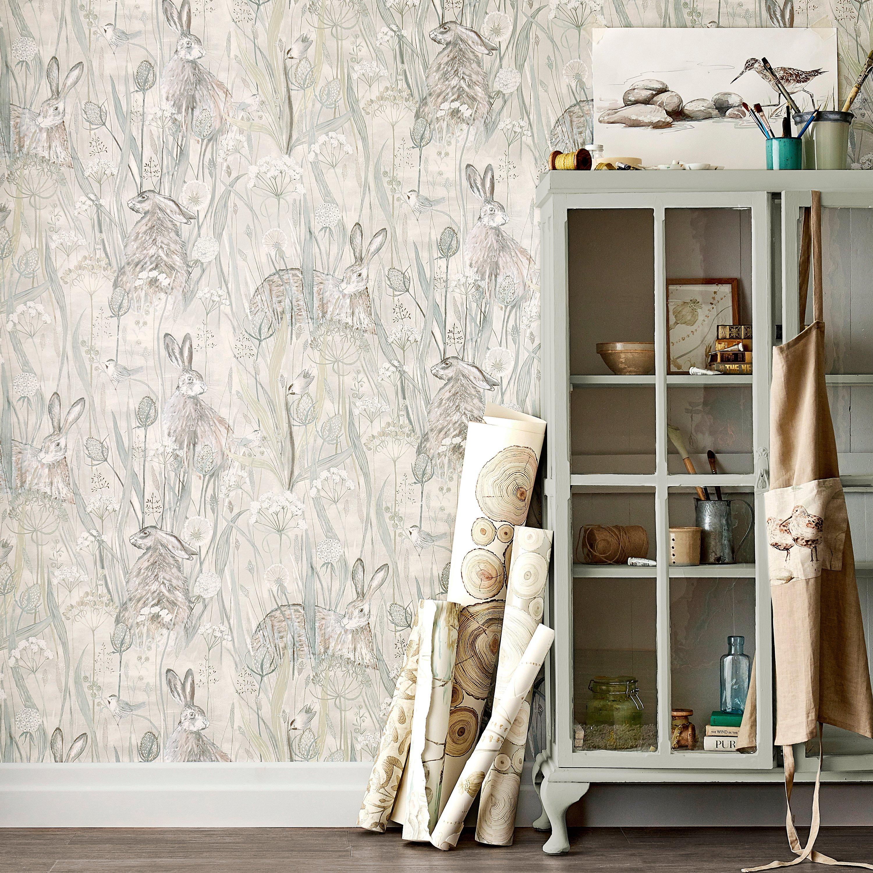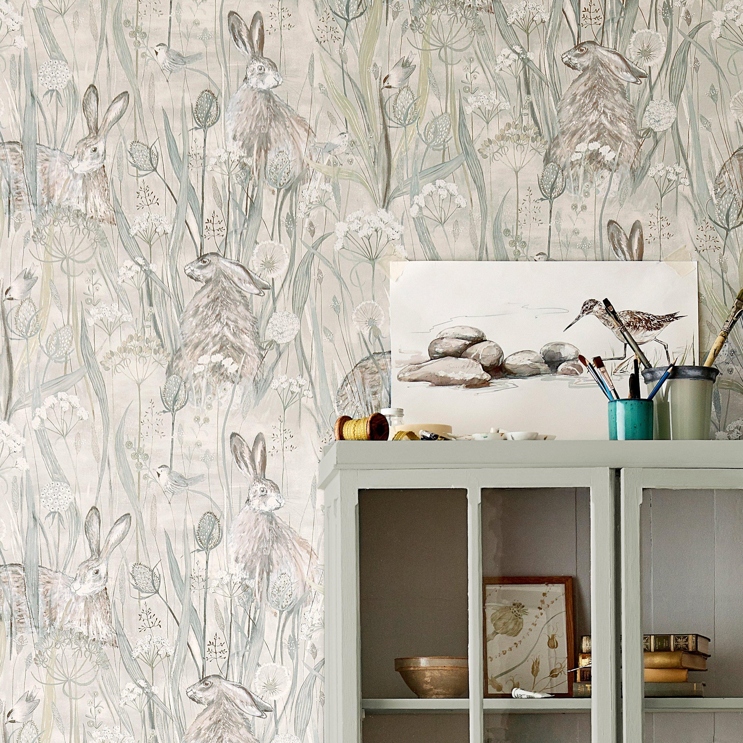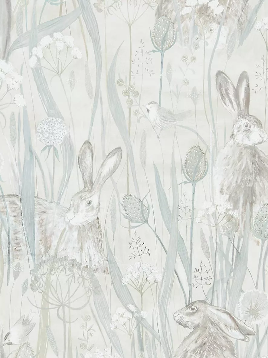 A misty, romantic design with a hand painted effect, showing country and seaside mingling with hares peeping cautiously through flower and seed heads.