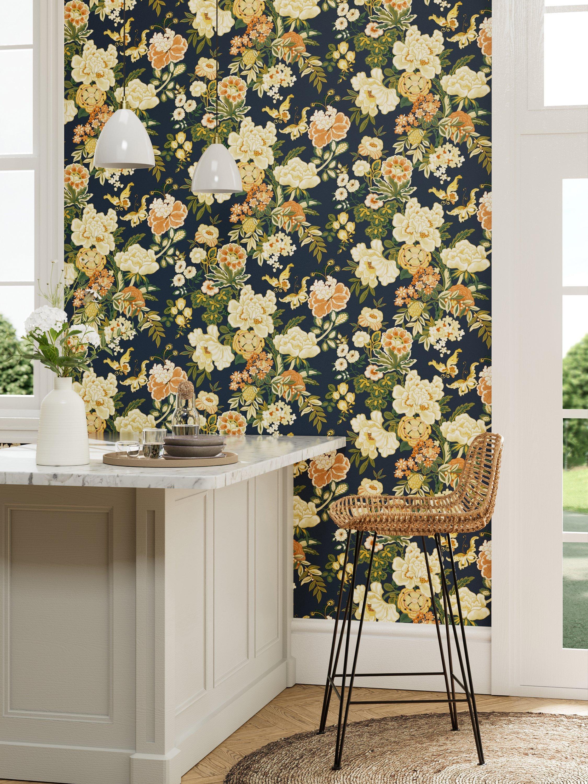 In contrast to its blousy Victorian contemporaries, the Chinese inspired decorative style of this 1920s Jeffrey & Co. archive design is adorned with large peonies and tropical butterflies. A wide width wallpaper, its opaque detail pays homage to the block printed original, elevated even further by the addition of subtle metallic highlights.