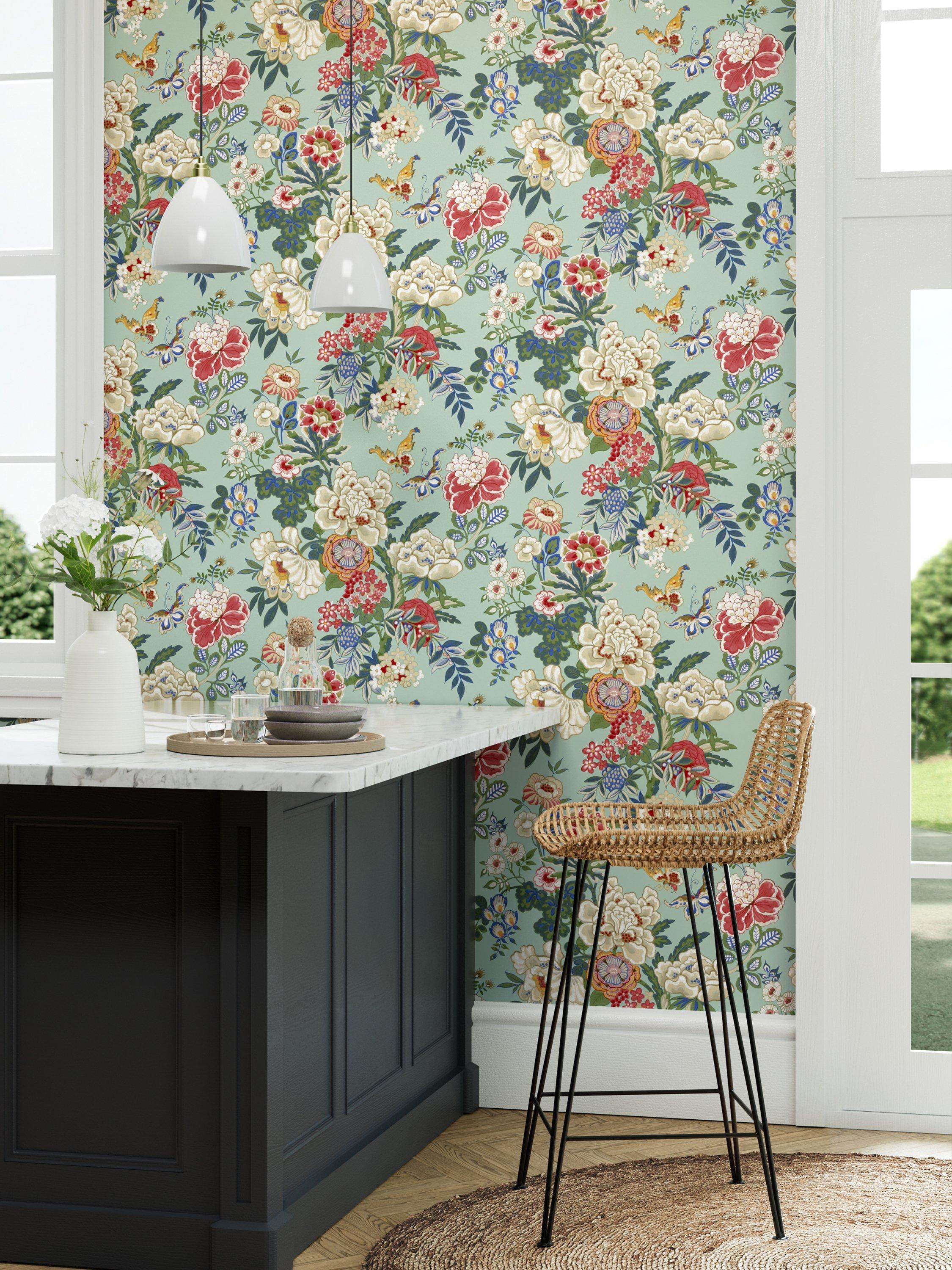 In contrast to its blousy Victorian contemporaries, the Chinese inspired decorative style of this 1920s Jeffrey & Co. archive design is adorned with large peonies and tropical butterflies. A wide width wallpaper, its opaque detail pays homage to the block printed original, elevated even further by the addition of subtle metallic highlights.