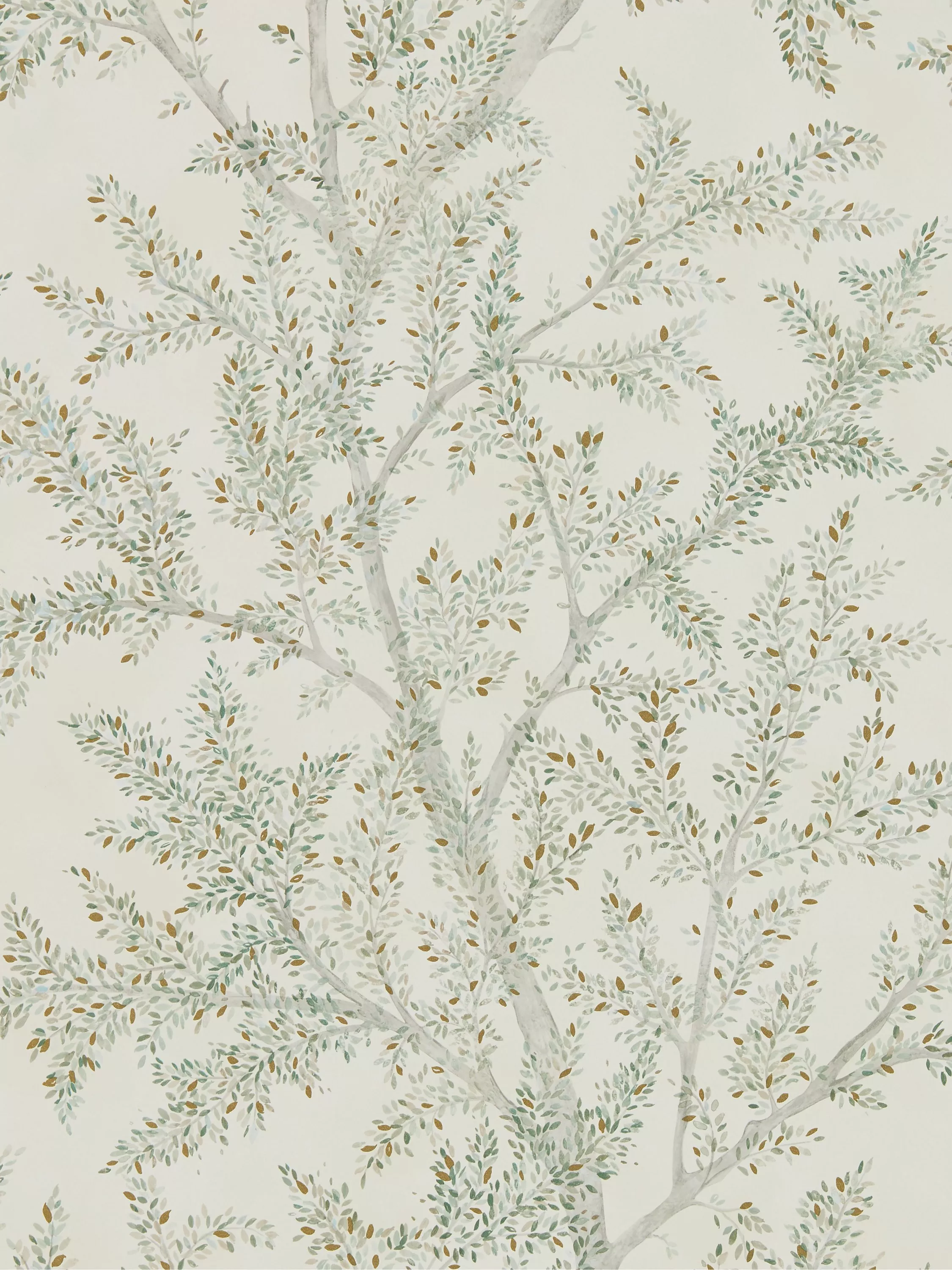 Gently undulating birch trees shimmer with metallic highlights, as tonal layers and delicate watercolour detail create an enchanting feel.
