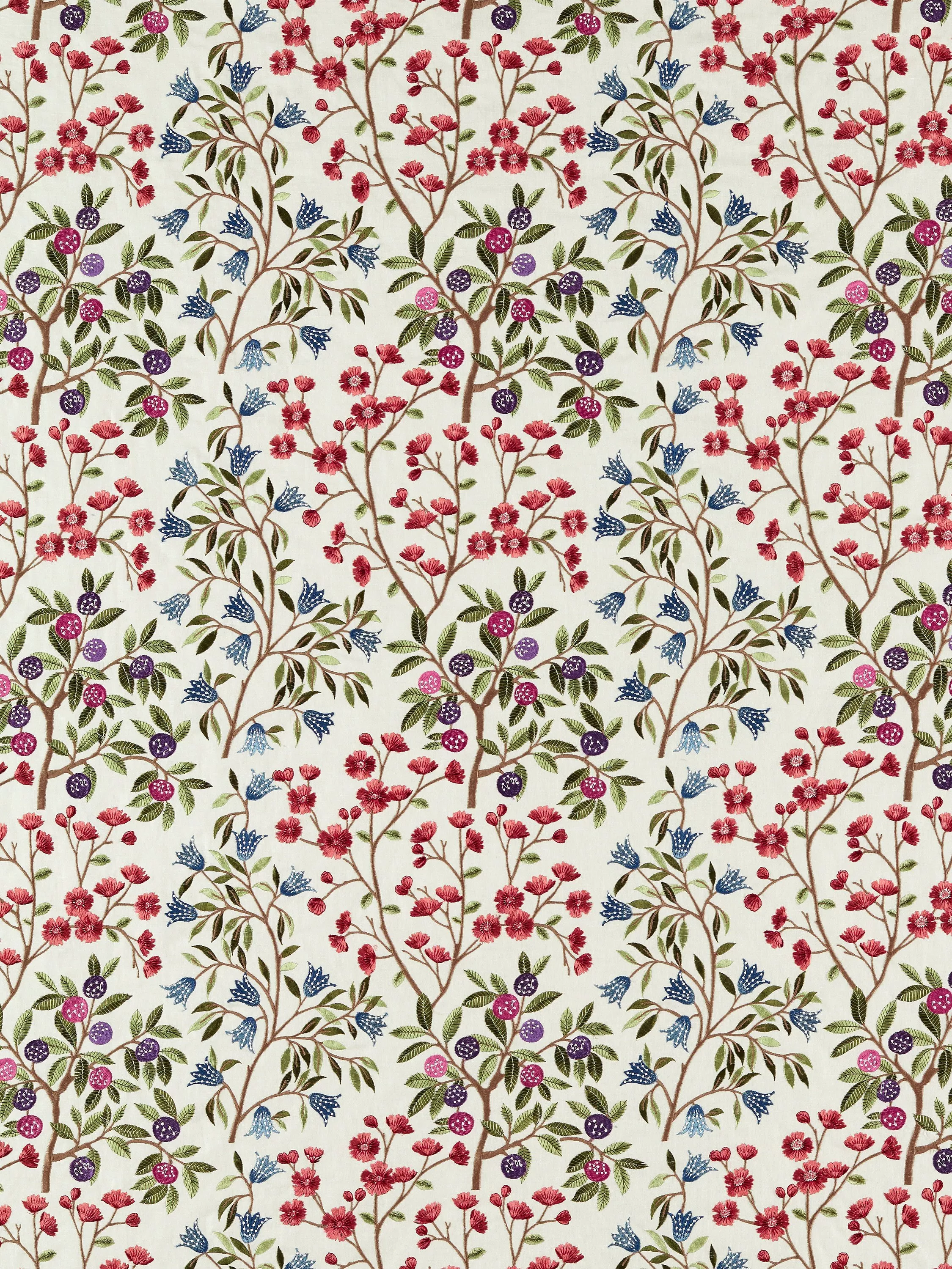 Intricately embroidered wild berries, sloes and blossom trail across this woodland-inspired design. Fine viscose thread adds a dew-like shimmer to a forager's harvest, stitched on a blend of cotton/linen.