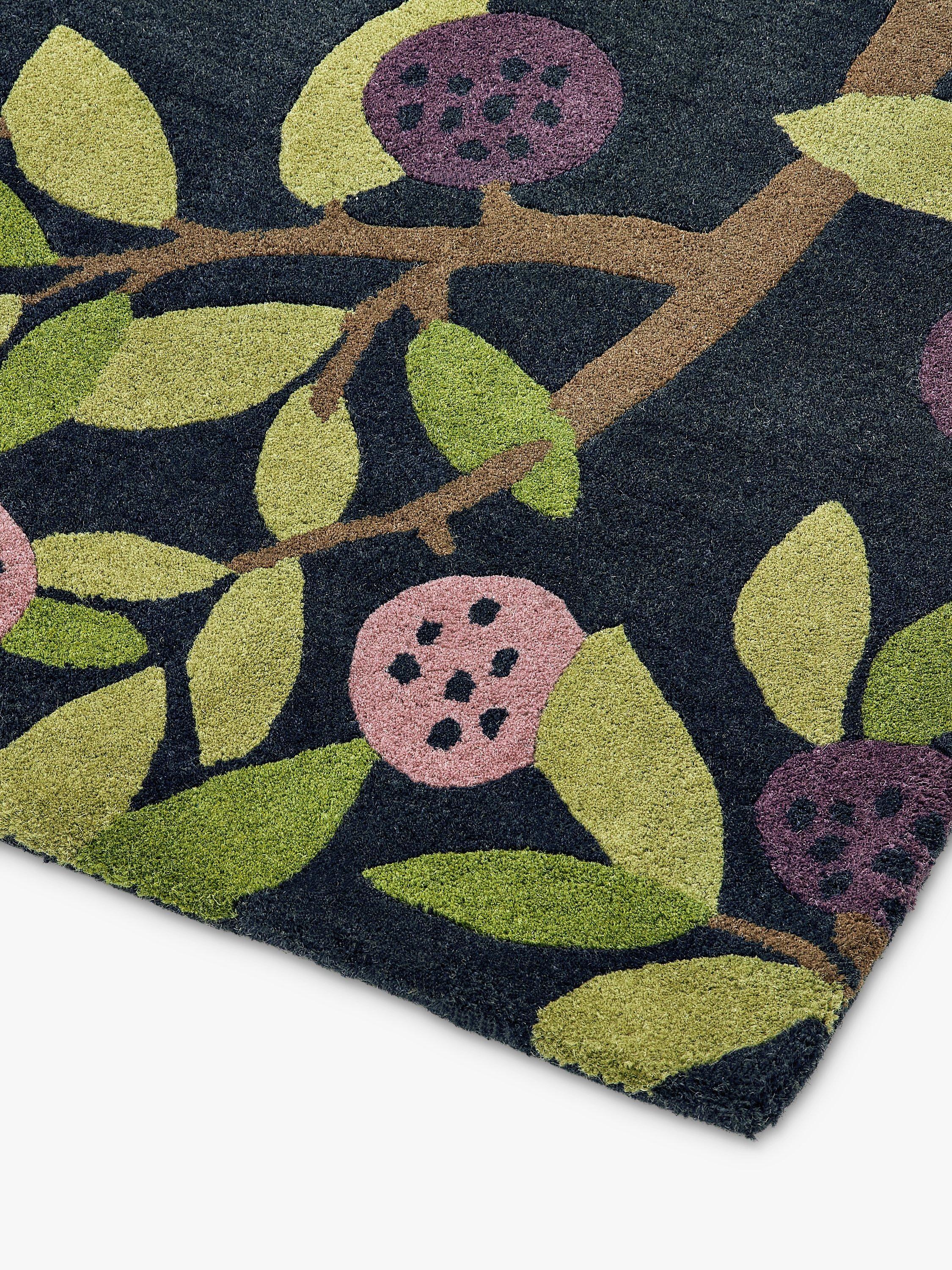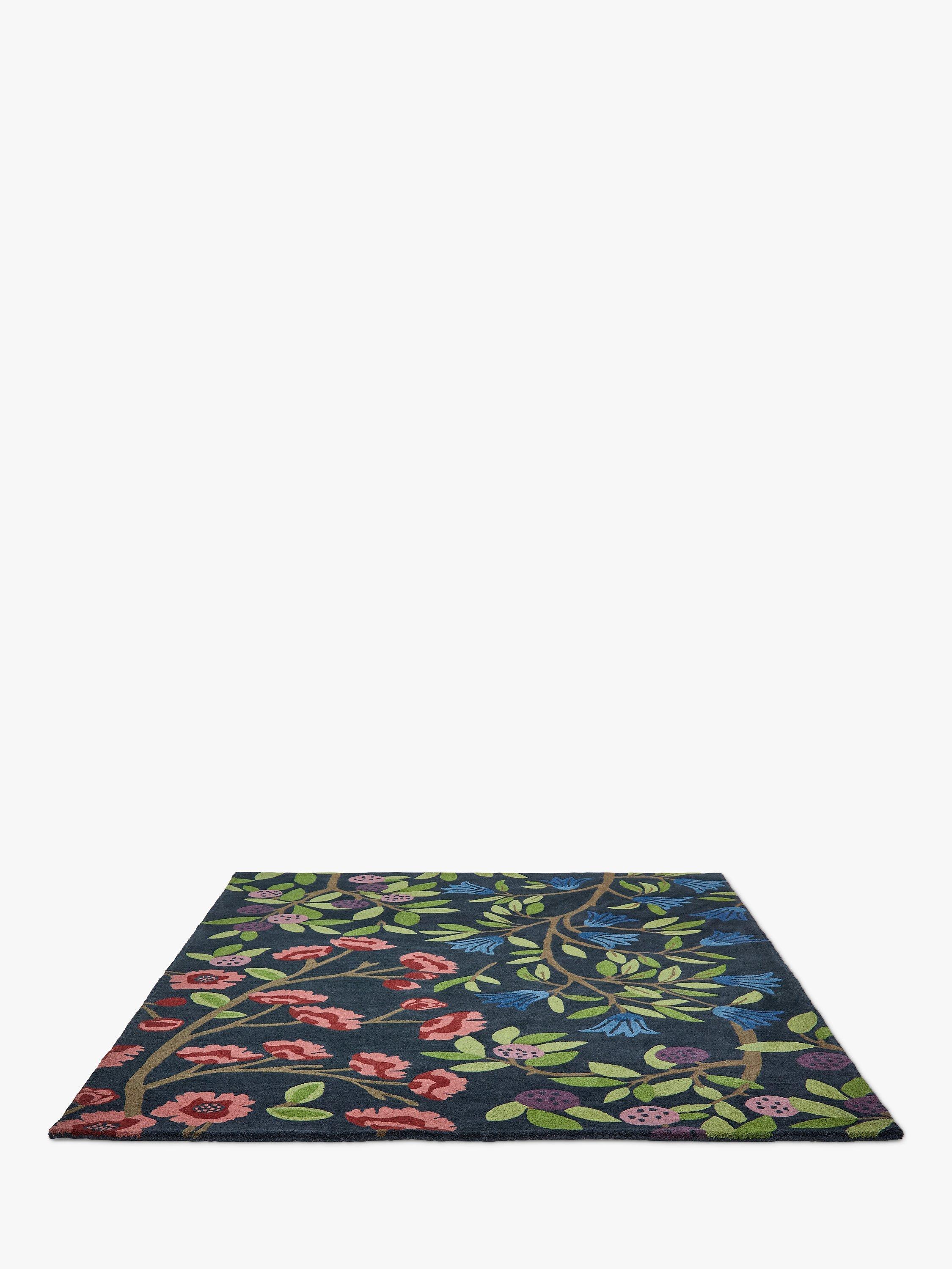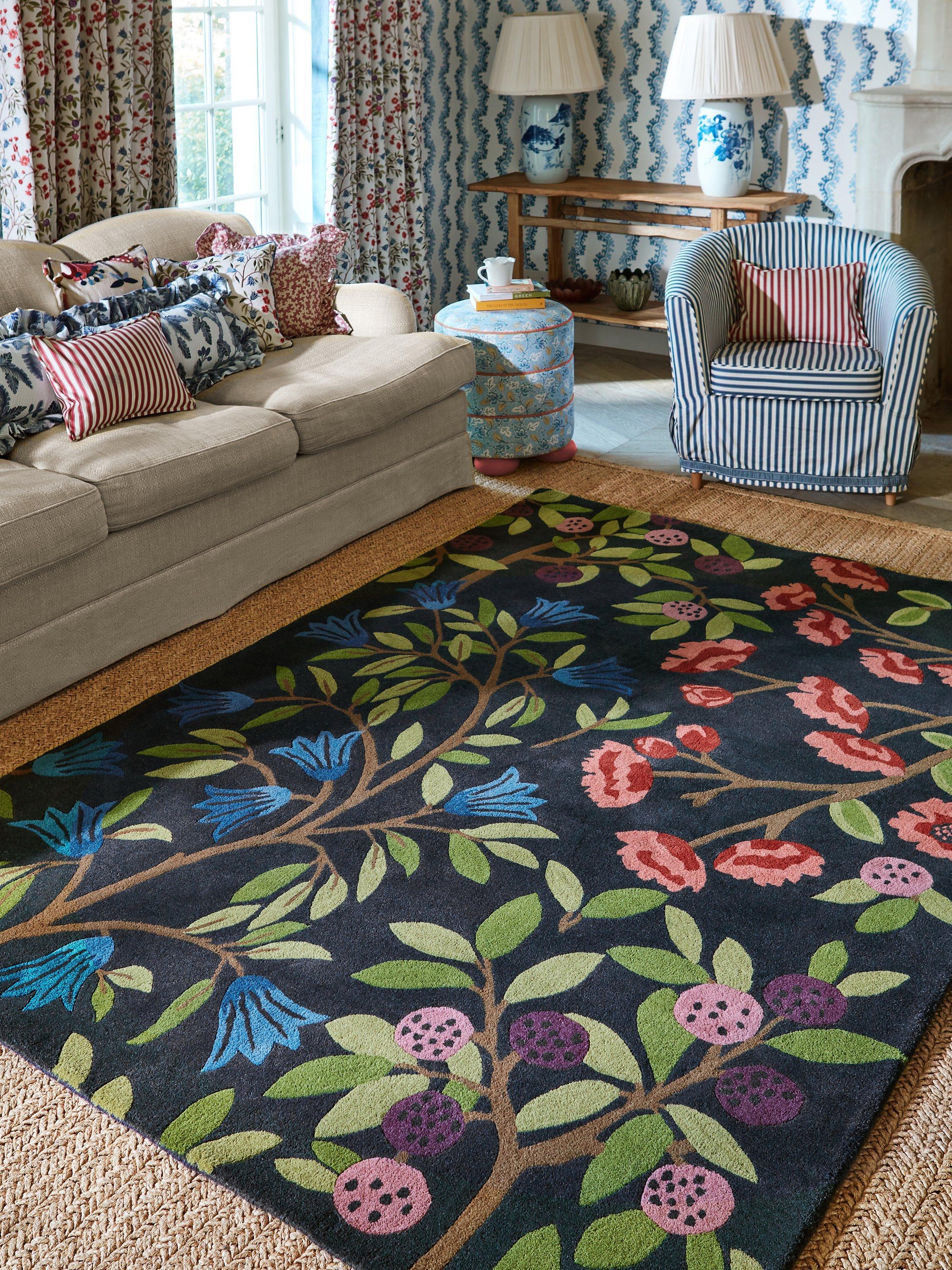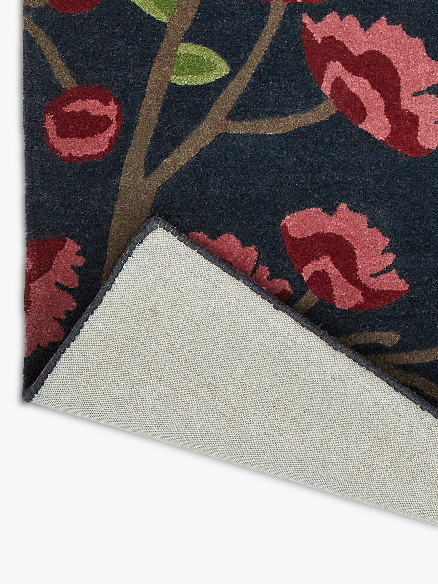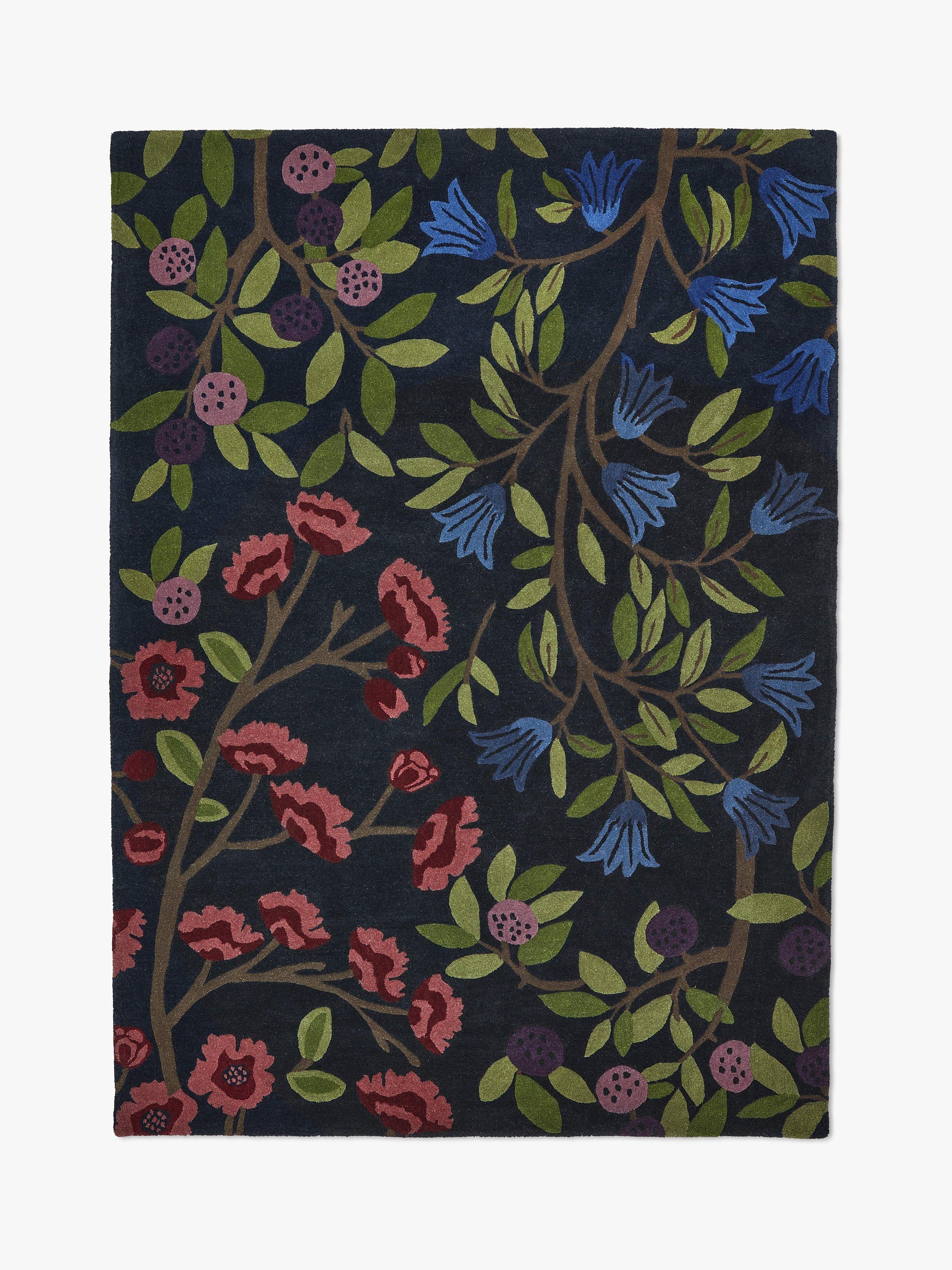 Originally an exquisite embroidery woodland-inspired design, intricate blooms of wild berries, sloes and blossom trail across this rug. A forager's harvest, this hand-tufted rug shows the full to bursting fruits and flowers in an image of midnight against the indigo background. 100% wool, this rug has a high-cut pile and is richly coloured.