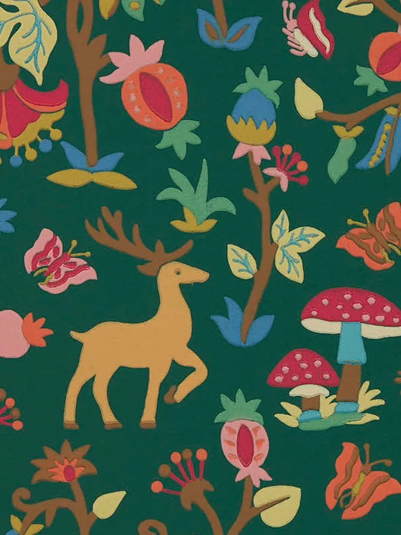 An enchanting interpretation of an age-old woodland scene, Forest of Dean is surface printed for an authentically chalky and hand-crafted look. Naively painted deer, ferns and butterflies add to this wallpaper's charming aesthetic.