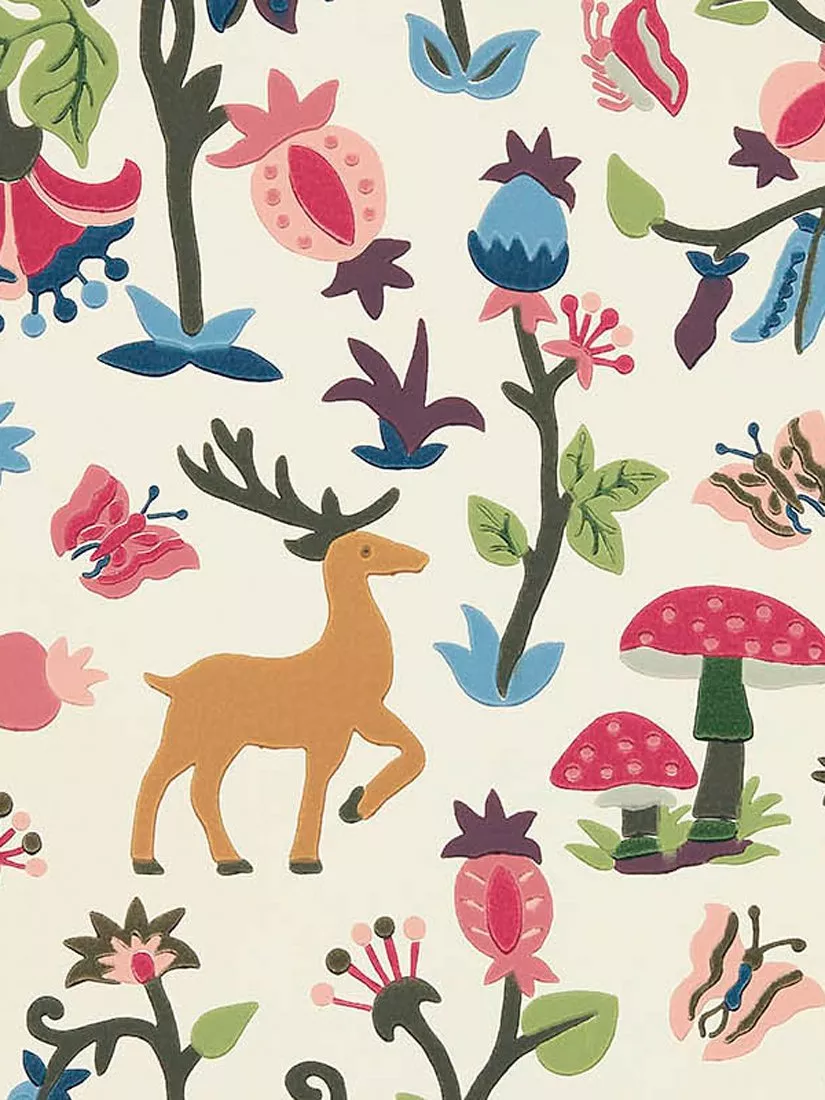 An enchanting interpretation of an age-old woodland scene, Forest of Dean is surface printed for an authentically chalky and hand-crafted look. Naively painted deer, ferns and butterflies add to this wallpaper's charming aesthetic.