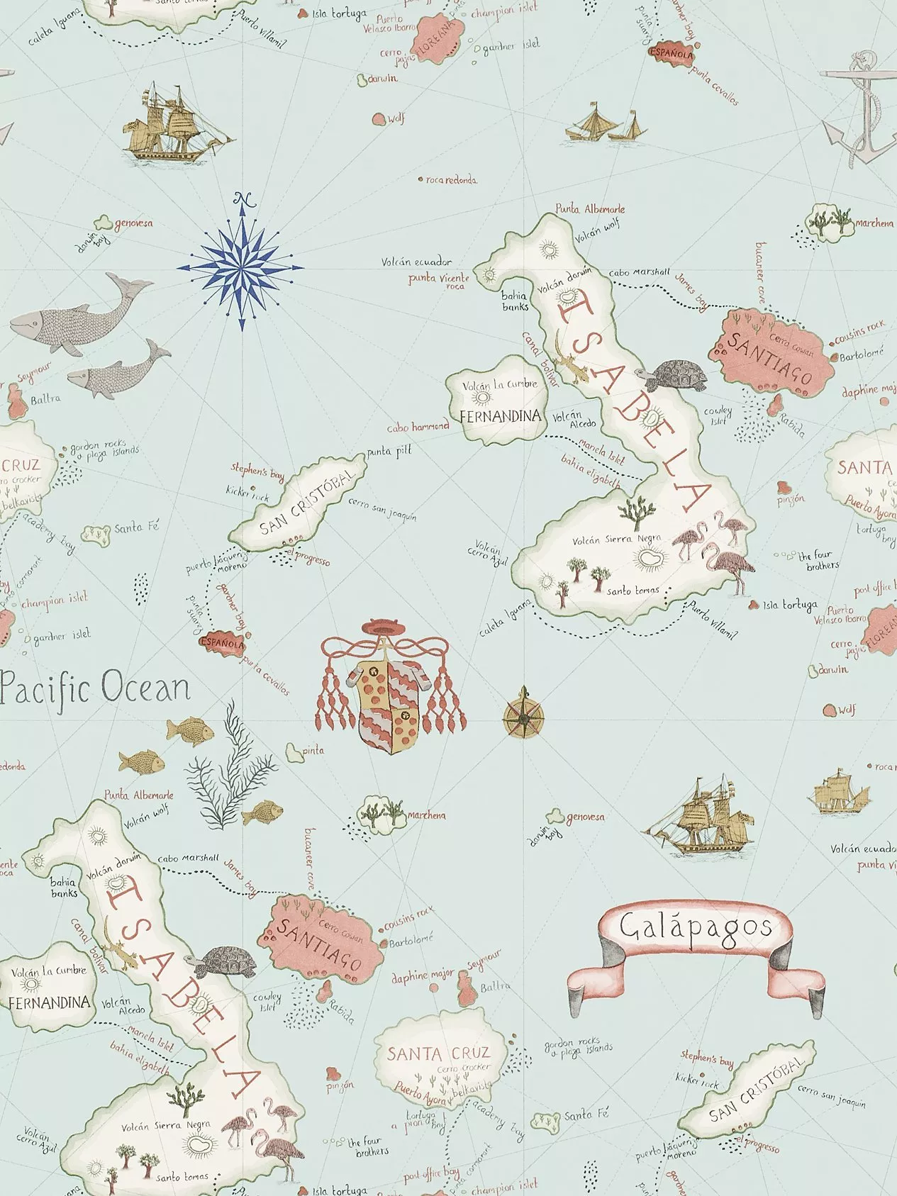 Galapagos depicts a vintage map of Darwin's famous archipelago. This is however no ordinary map: upon closer inspection, it comes to life with whimsical paintings of the islands' wildlife and marine life.