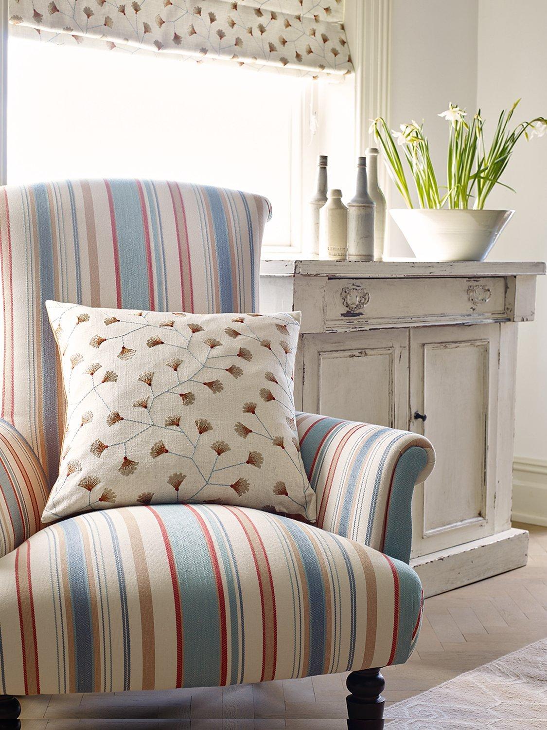 This embroidered leaf trail fabric has a modern, country style and features abstract gingko leaves in a range different colourways.