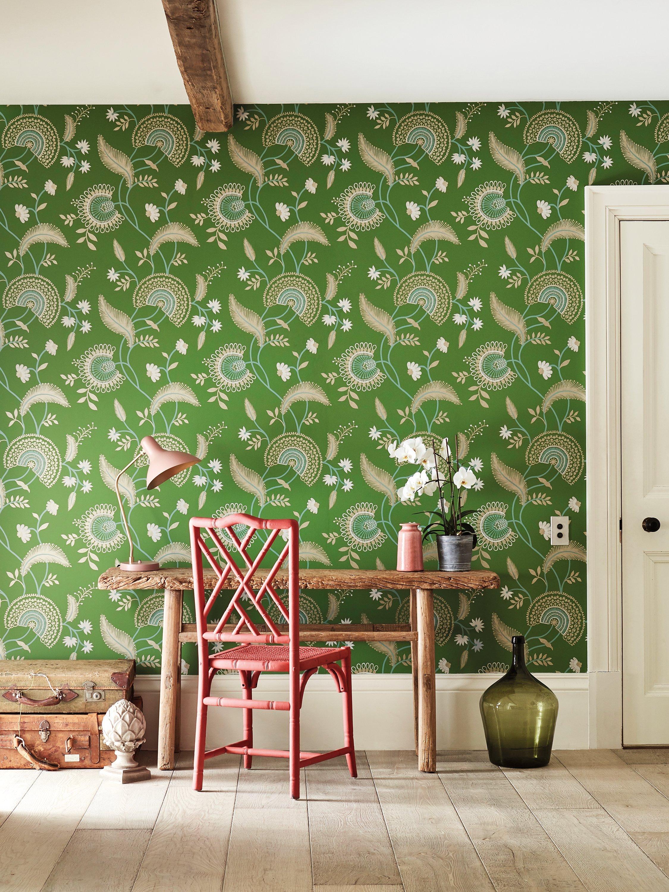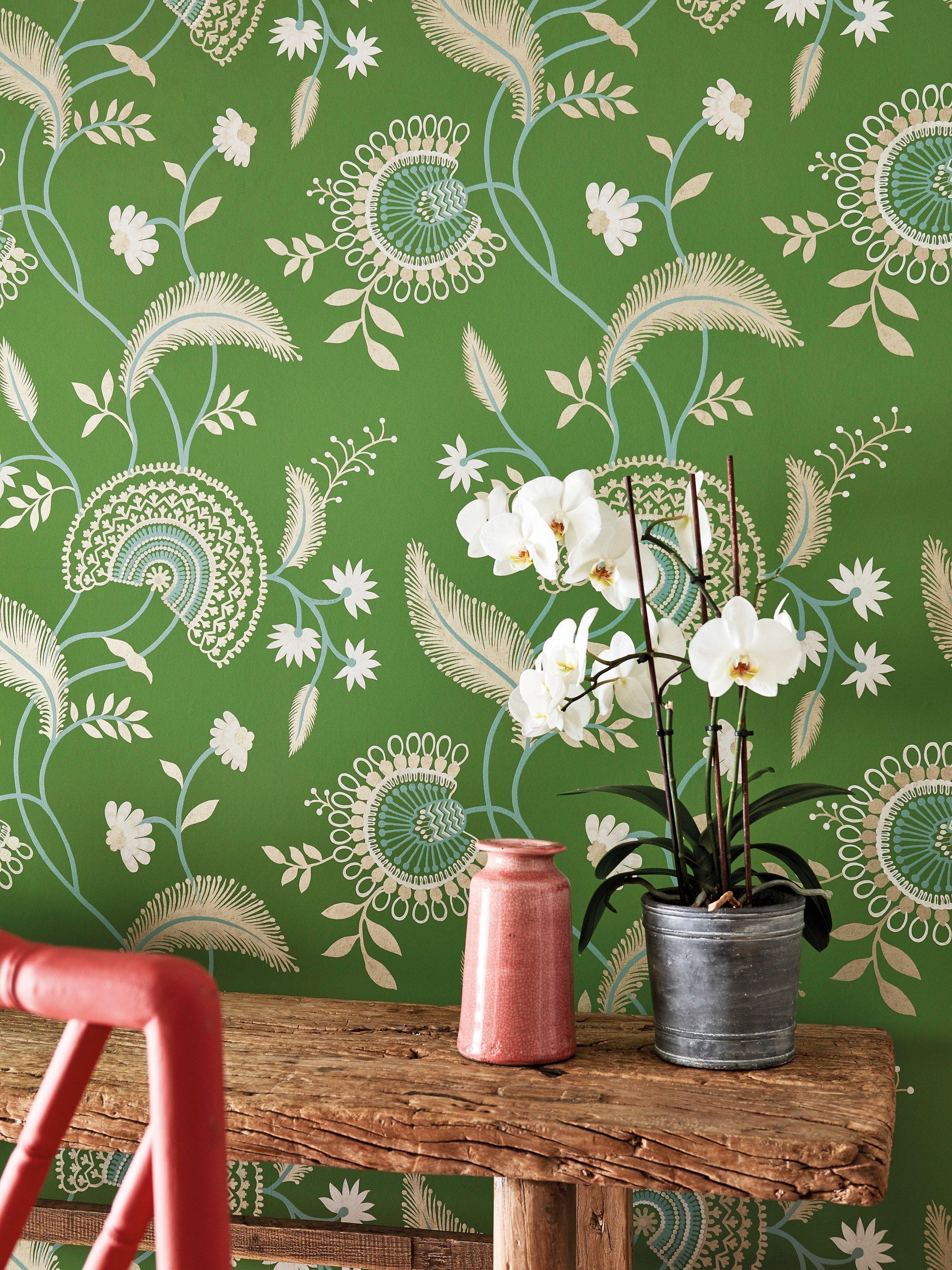 A rich wallpaper of stylised pods, flowers and leaves, this hand-painted Sanderson design has a lovely textural feel across its statement motifs.