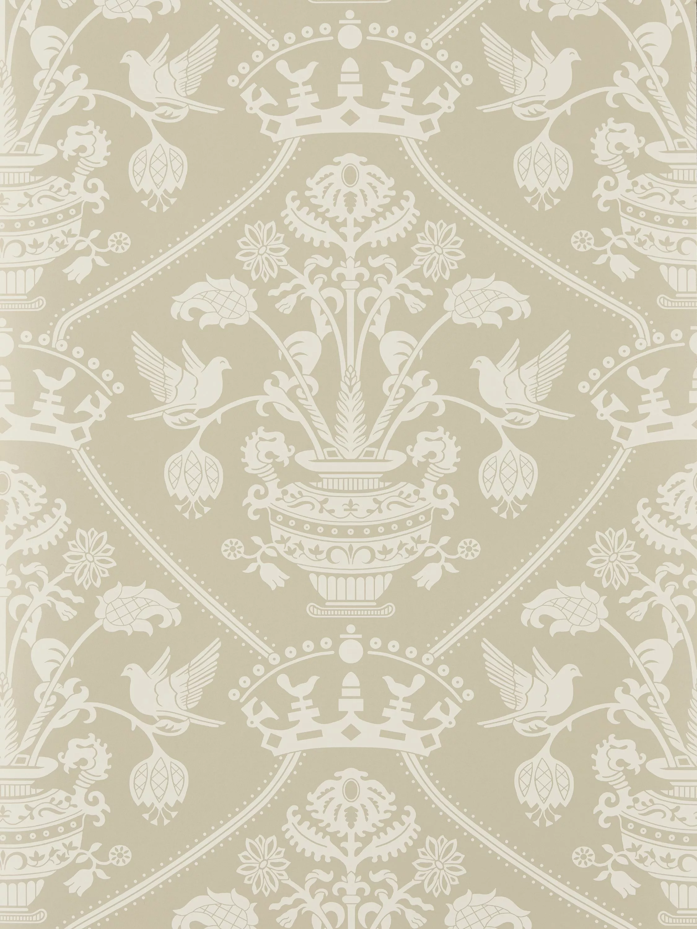 Originating from an archive document, Highgrove Damask has been designed incorporating the Highgrove Crest and peaceful doves. The wallpaper has been rotary printed to retain a smart, chalky matt finish and opaque ink coverage.