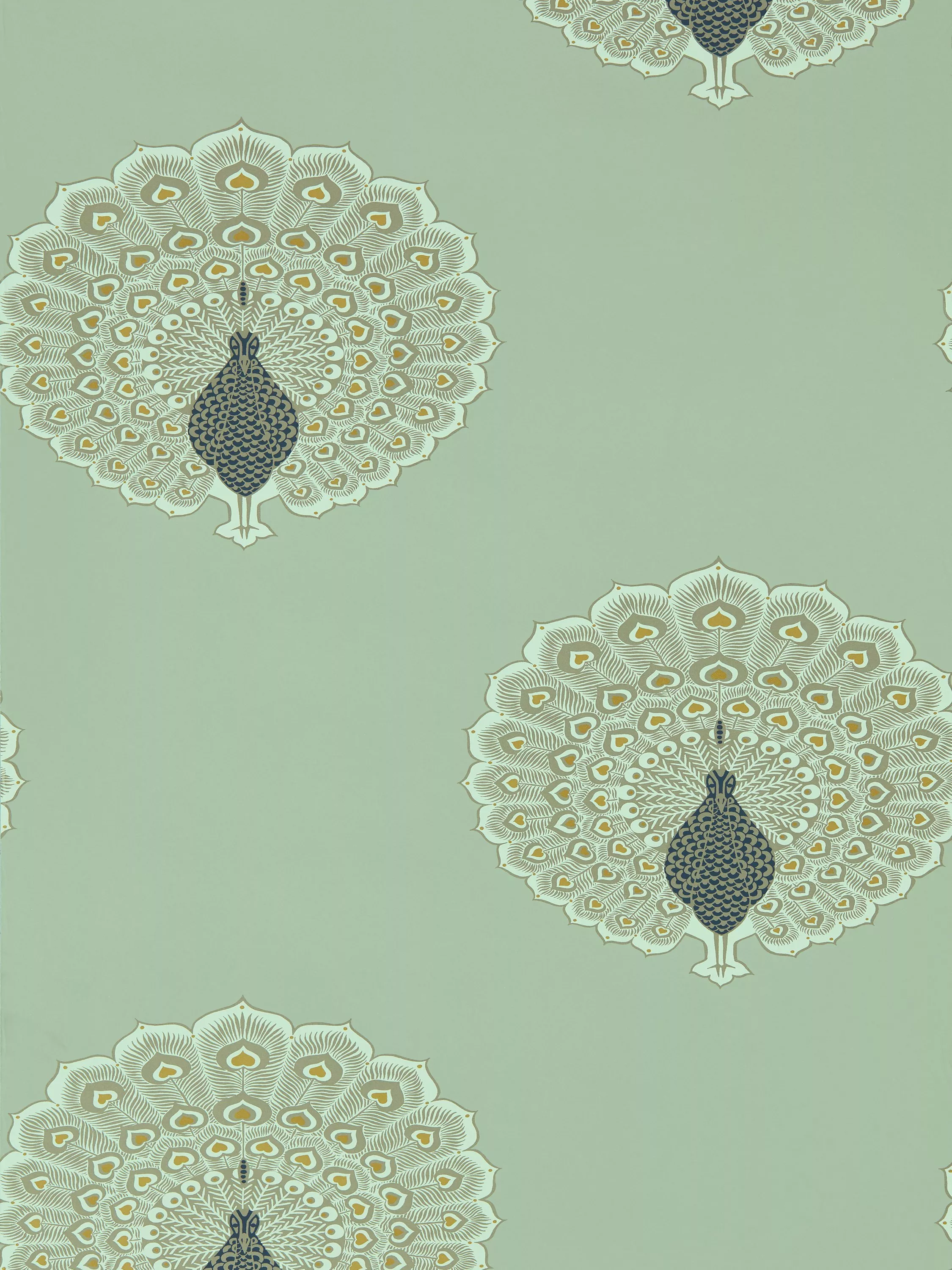 A powerful symbol of royalty and faithfulness, characterful peacocks with their glorious metallic tail feathers stand proudly on this striking wallpaper, which was inspired by a fragment of 19th century Indian chintz from the Sanderson archive.