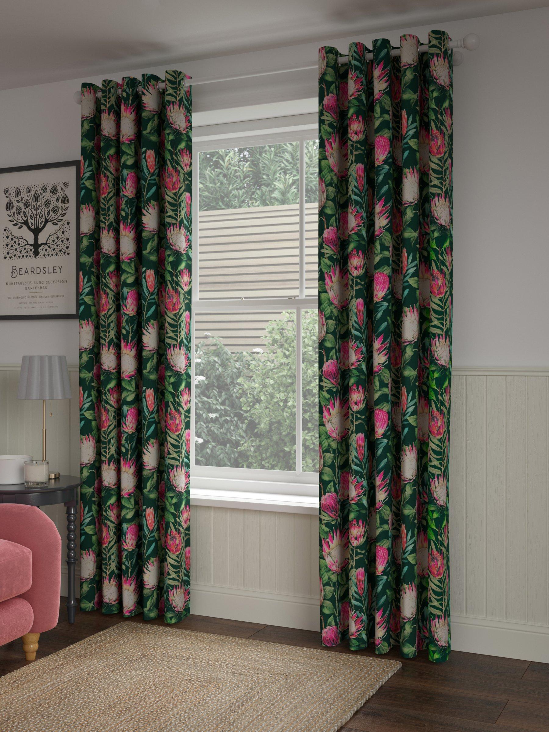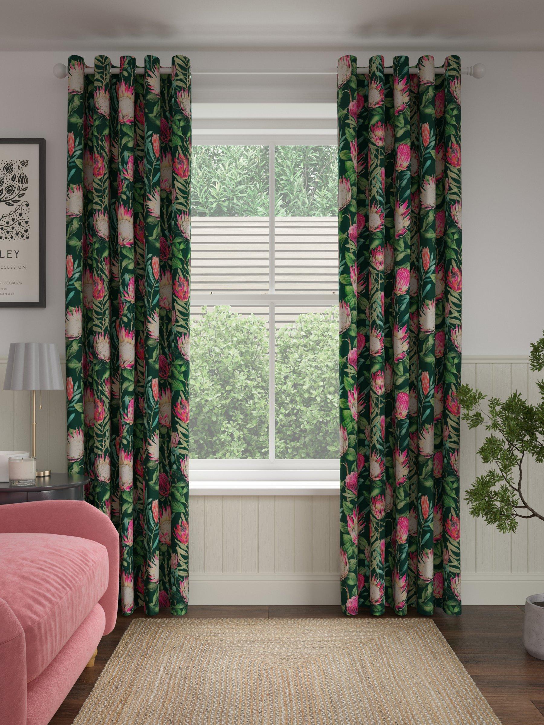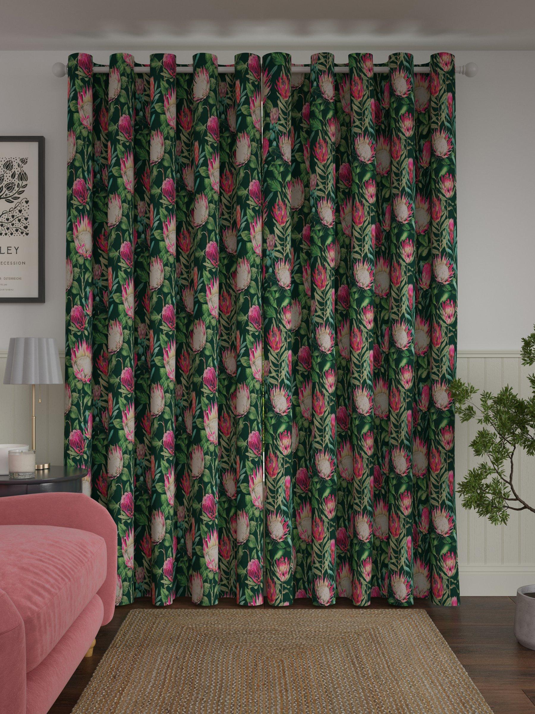 From the Sanderson archives, this curtain design is a repainted watercolour of an old design. The exotic King Protea flower adorns the fabric, fully covering the cotton ground. The curtains have a contemporary eyelet heading and are fully lined, which adds the perfect finish, improving the drape and enhancing the vibrancy of the pattern.