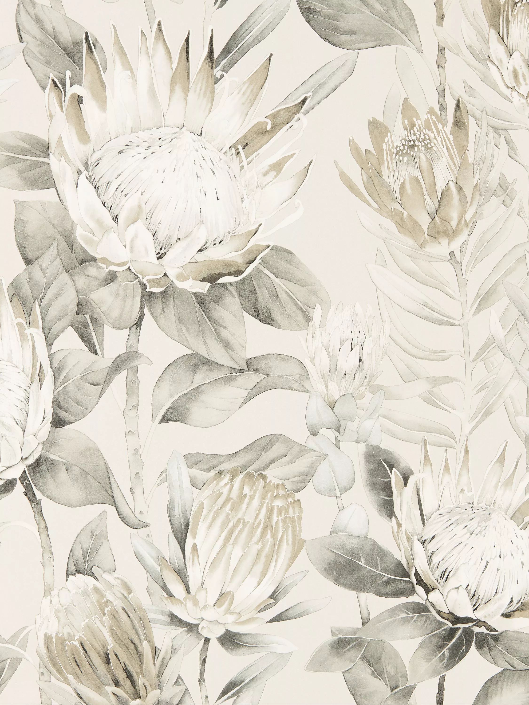 The majestic flowerheads of the King Protea plant have been faithfully interpreted and recoloured to create this stunning statement wallpaper.