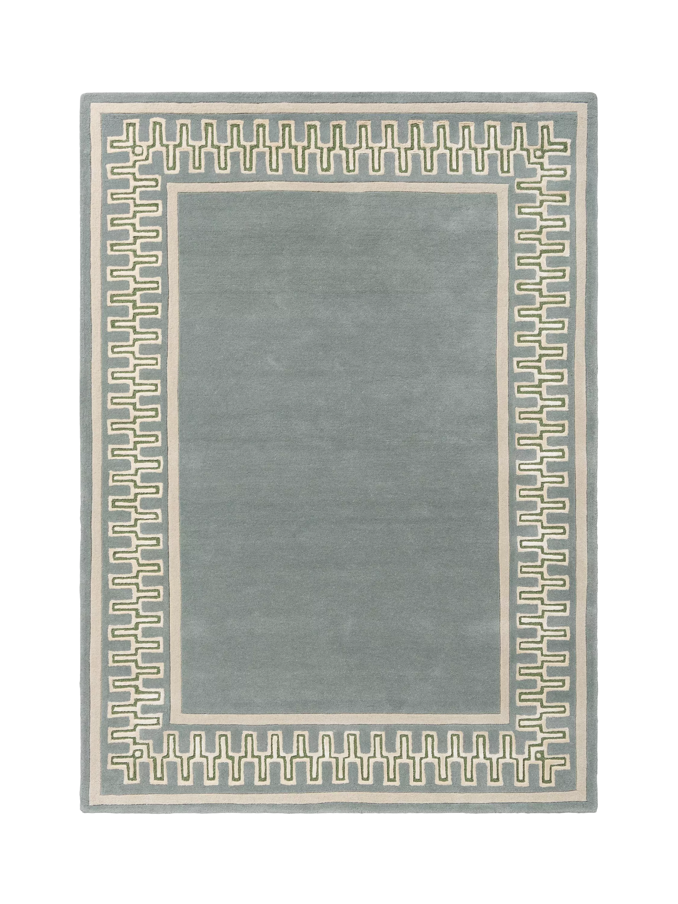 A playfully geometric border, echoing patterns from classical antiquity, frames this rug, set in smart contrasting tones of jade and flax.