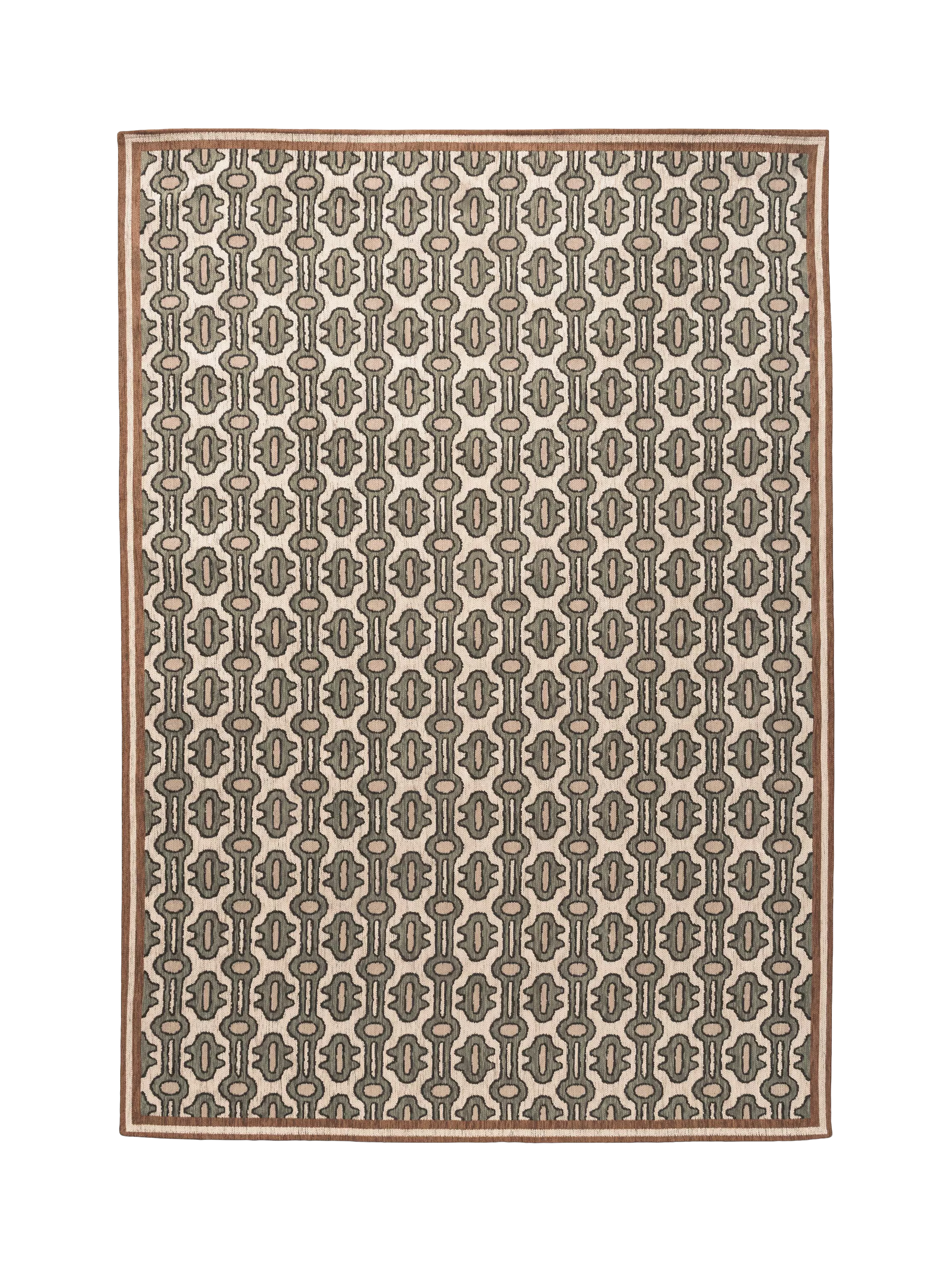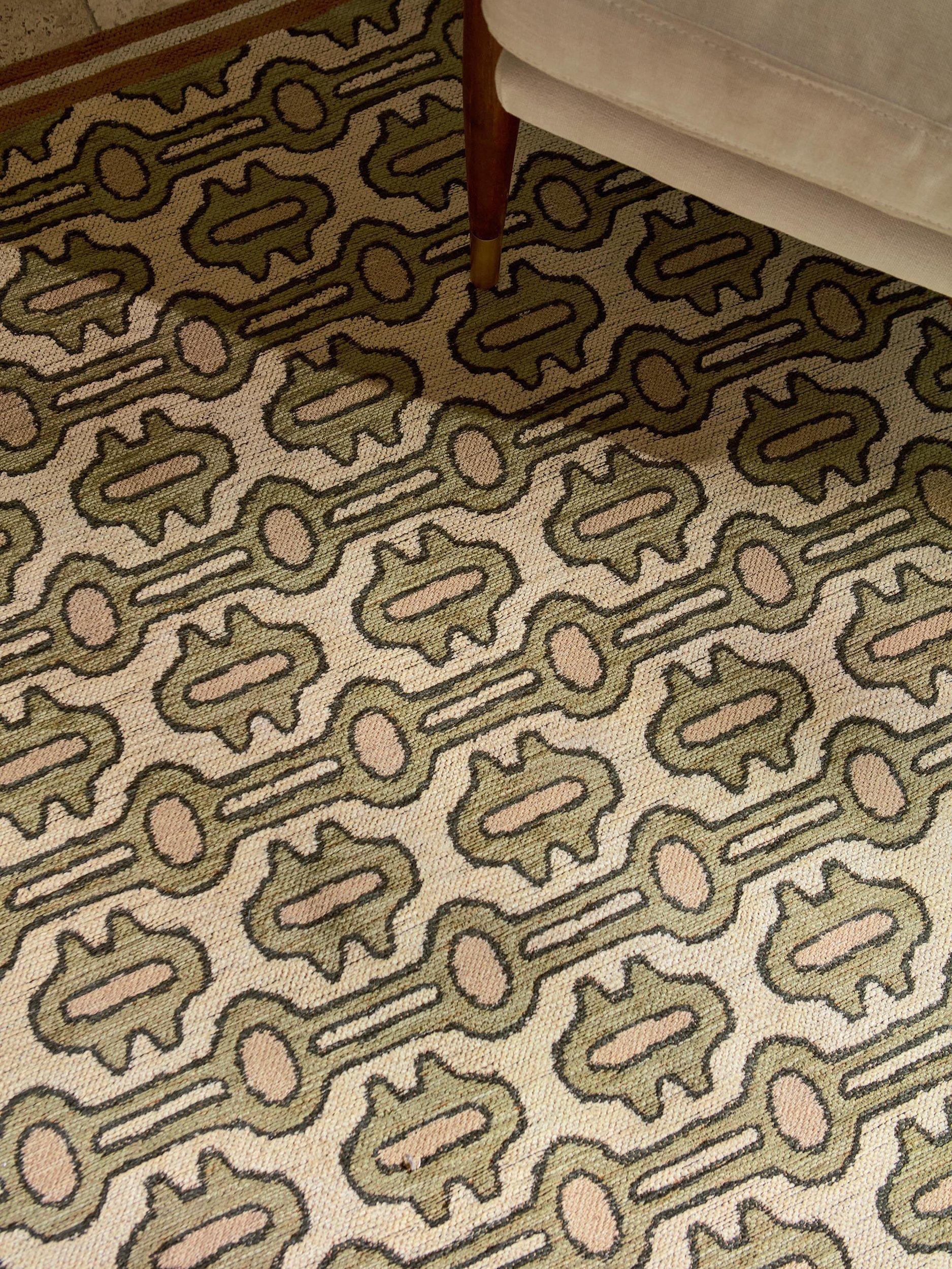 Meaning ‘tied threads,’ this abstracted pattern is intricately rendered in a jacquard weave and framed by a contrasting double-lined border.