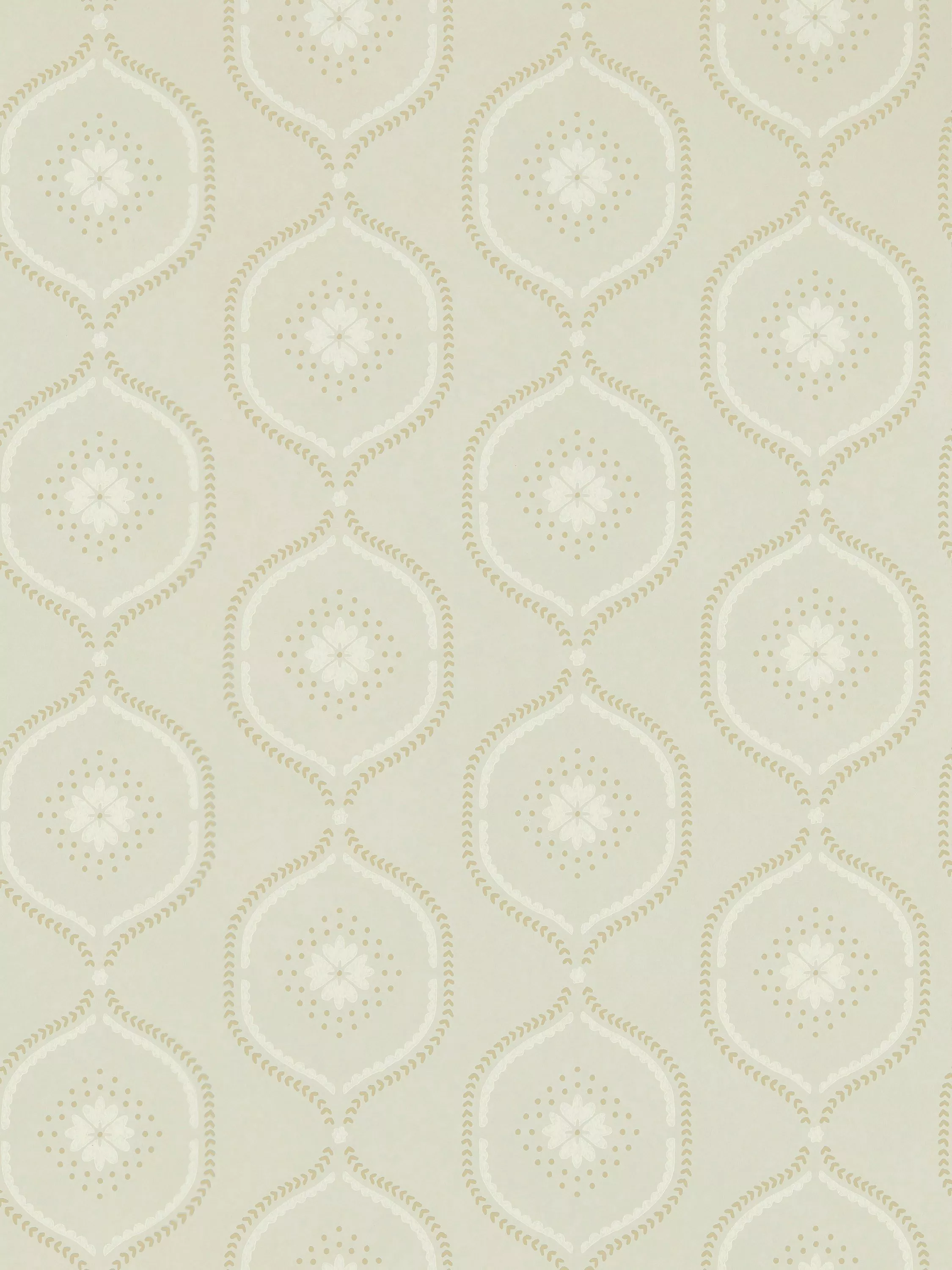 With a chalky ground and hand block printed look, this wallpaper's stylised ogee trellis houses a delicate flower and decorative dots across its pretty colour palette.