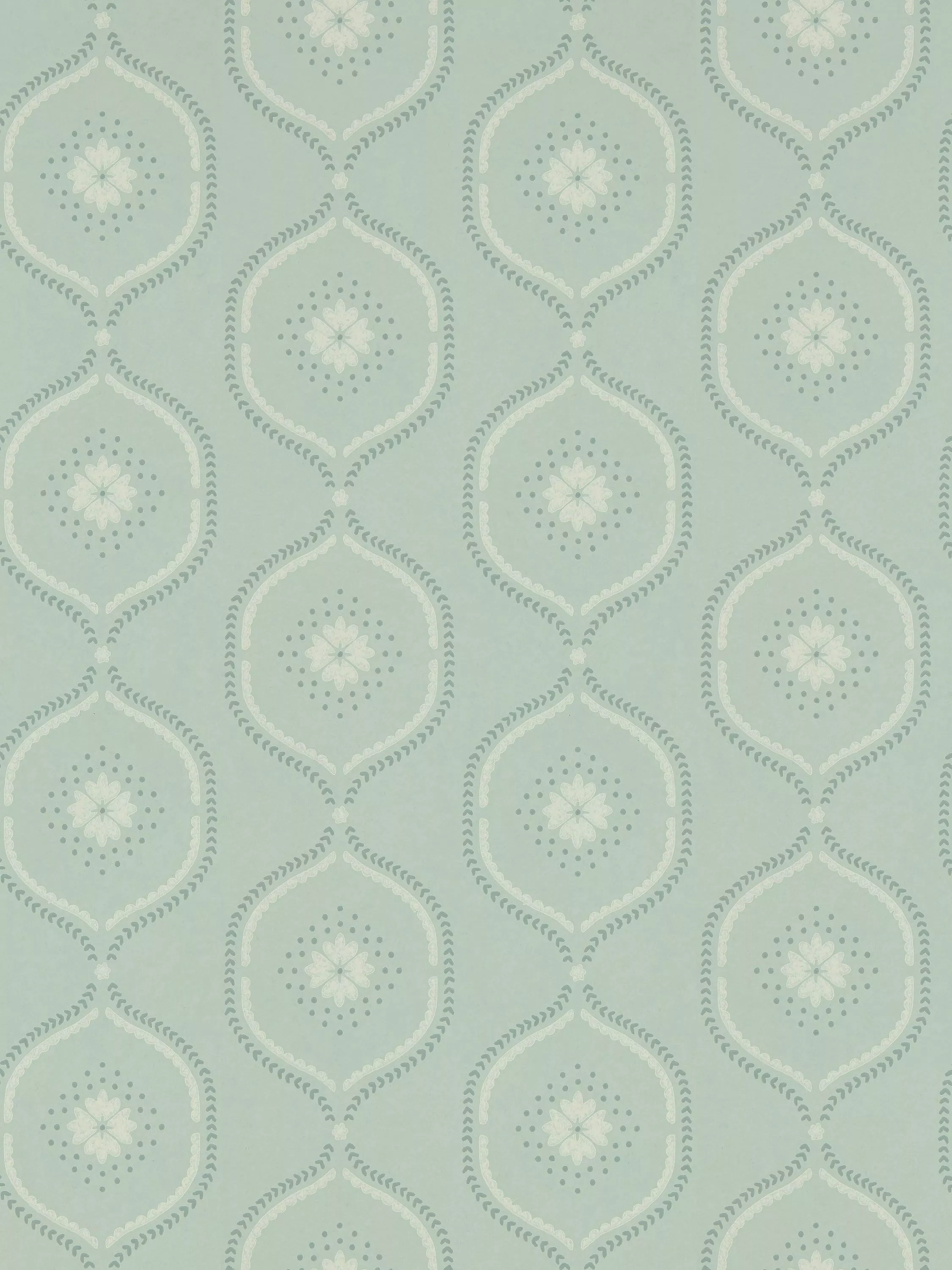 With a chalky ground and hand block printed look, this wallpaper's stylised ogee trellis houses a delicate flower and decorative dots across its pretty colour palette.
