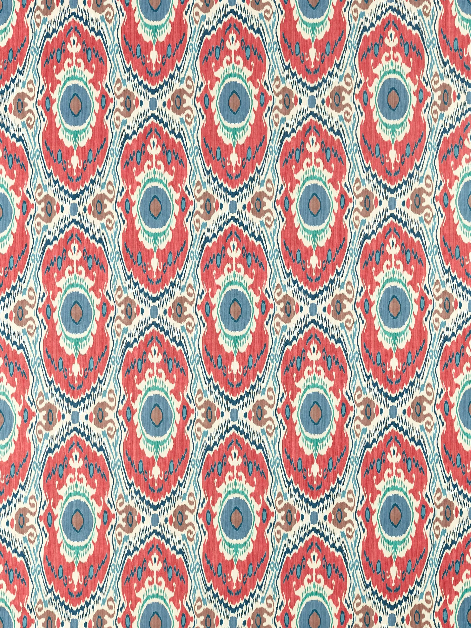 With its bold colours and complex pattern representative of the ikat silks woven in Uzbekistan, this colourful multidirectional repeated motif is printed on a lovely dual purpose cotton satin.
