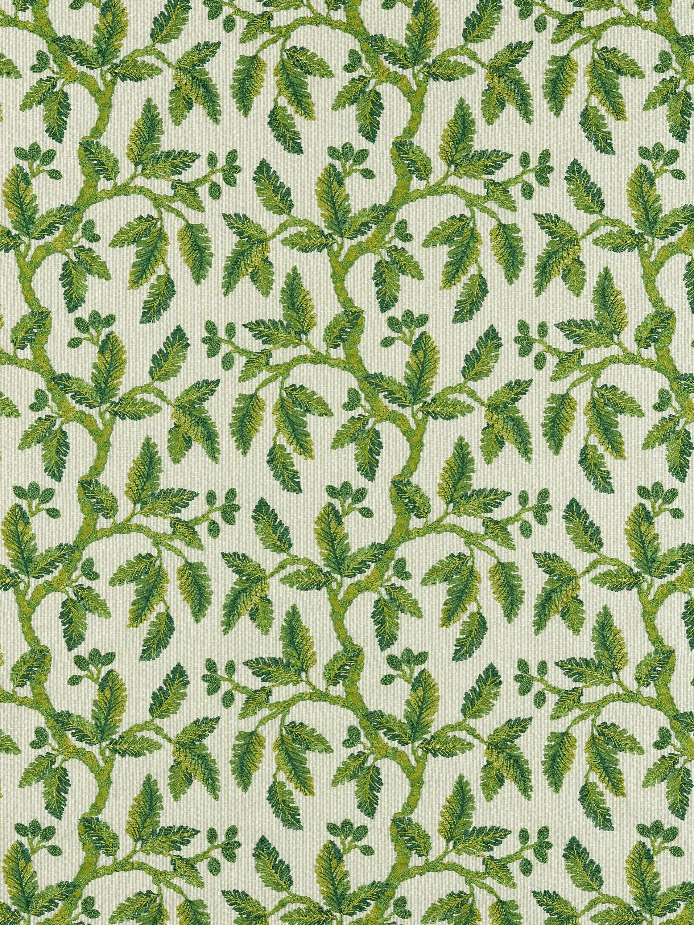 An all-over leaf trail of oaks and acorns is embroidered onto a pinstripe jacquard ground using a beautifully chunky cotton thread. Combining country looks with a classic stripe and chunky matt cotton stitchwork, oaknut is another name for acorn.